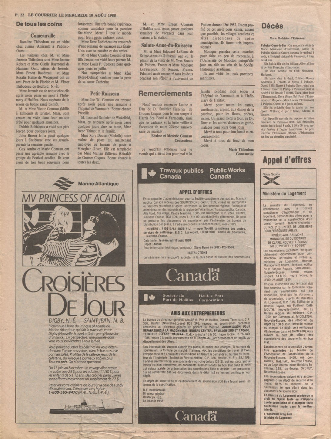 Le Courrier is Nova Scotia's leading French-language newspaper, and the only one with province-wide coverage and distribution. First published by Désiré d'Éon as Le Petit Courrier (Du Sud-Ouest de la Nouvelle-Écosse) on 10 February 1937, it has appeared weekly ever since, informing its readers, defending the interests of Acadians and francophones, and providing a bridge linking all Acadian regions in the province. It offers community news and events, extended articles, advertisements, announcements, photographs and special supplements, all directed towards supporting Nova Scotia's large, dispersed and diversified Acadian population, its businesses, industries, economy, daily activities, schools and higher education, politics, cultural life and heritage. Le Courrier offers an outstanding and unparalleled perspective on 66 years' accumulated history of Nova Scotia's Acadian population, thus enabling exploration of interests, activities, accomplishments, concerns and community issues across a broad swath of the 20th century.