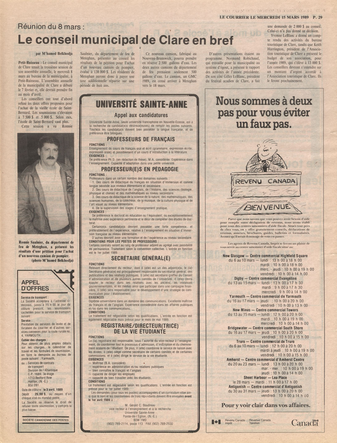 Le Courrier is Nova Scotia's leading French-language newspaper, and the only one with province-wide coverage and distribution. First published by Désiré d'Éon as Le Petit Courrier (Du Sud-Ouest de la Nouvelle-Écosse) on 10 February 1937, it has appeared weekly ever since, informing its readers, defending the interests of Acadians and francophones, and providing a bridge linking all Acadian regions in the province. It offers community news and events, extended articles, advertisements, announcements, photographs and special supplements, all directed towards supporting Nova Scotia's large, dispersed and diversified Acadian population, its businesses, industries, economy, daily activities, schools and higher education, politics, cultural life and heritage. Le Courrier offers an outstanding and unparalleled perspective on 66 years' accumulated history of Nova Scotia's Acadian population, thus enabling exploration of interests, activities, accomplishments, concerns and community issues across a broad swath of the 20th century.