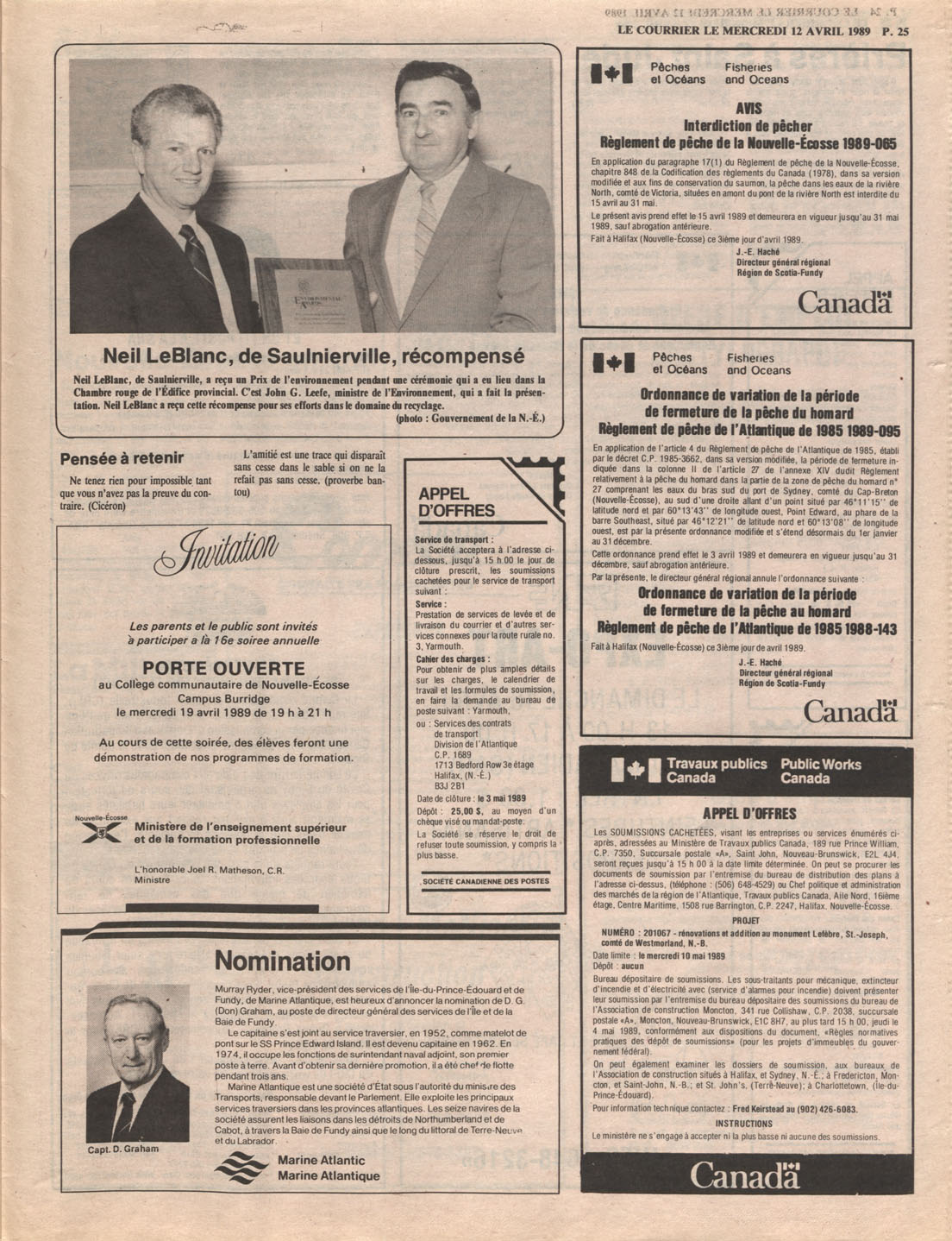 Le Courrier is Nova Scotia's leading French-language newspaper, and the only one with province-wide coverage and distribution. First published by Désiré d'Éon as Le Petit Courrier (Du Sud-Ouest de la Nouvelle-Écosse) on 10 February 1937, it has appeared weekly ever since, informing its readers, defending the interests of Acadians and francophones, and providing a bridge linking all Acadian regions in the province. It offers community news and events, extended articles, advertisements, announcements, photographs and special supplements, all directed towards supporting Nova Scotia's large, dispersed and diversified Acadian population, its businesses, industries, economy, daily activities, schools and higher education, politics, cultural life and heritage. Le Courrier offers an outstanding and unparalleled perspective on 66 years' accumulated history of Nova Scotia's Acadian population, thus enabling exploration of interests, activities, accomplishments, concerns and community issues across a broad swath of the 20th century.