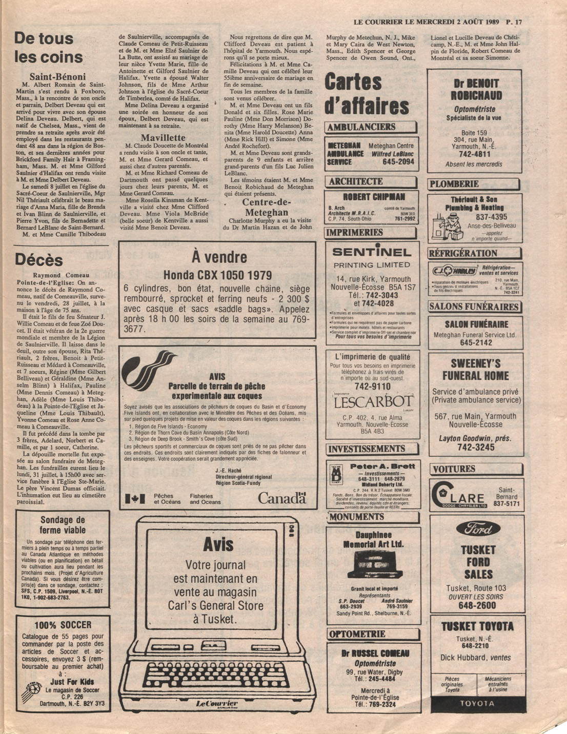 Le Courrier is Nova Scotia's leading French-language newspaper, and the only one with province-wide coverage and distribution. First published by Désiré d'Éon as Le Petit Courrier (Du Sud-Ouest de la Nouvelle-Écosse) on 10 February 1937, it has appeared weekly ever since, informing its readers, defending the interests of Acadians and francophones, and providing a bridge linking all Acadian regions in the province. It offers community news and events, extended articles, advertisements, announcements, photographs and special supplements, all directed towards supporting Nova Scotia's large, dispersed and diversified Acadian population, its businesses, industries, economy, daily activities, schools and higher education, politics, cultural life and heritage. Le Courrier offers an outstanding and unparalleled perspective on 66 years' accumulated history of Nova Scotia's Acadian population, thus enabling exploration of interests, activities, accomplishments, concerns and community issues across a broad swath of the 20th century.