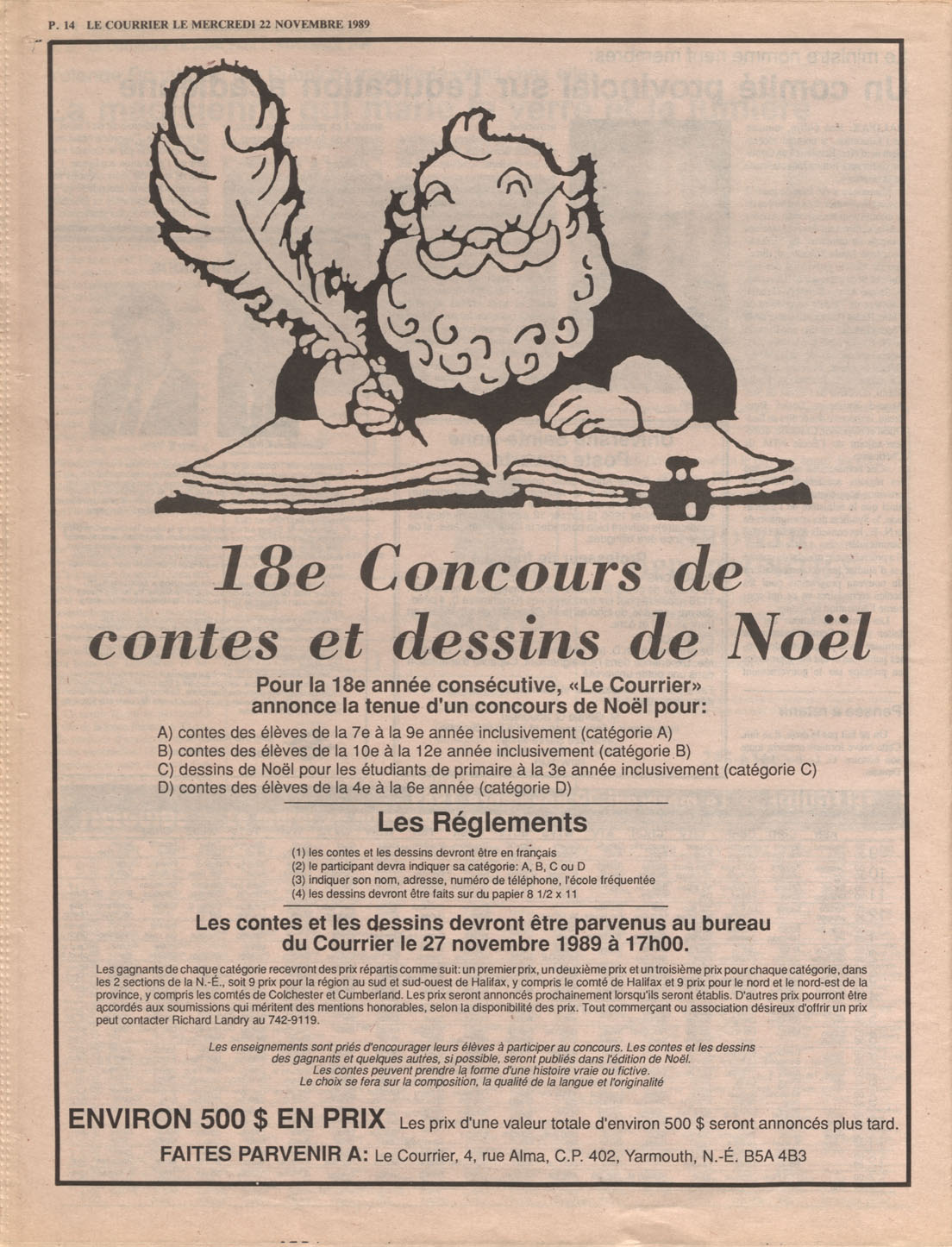 Le Courrier is Nova Scotia's leading French-language newspaper, and the only one with province-wide coverage and distribution. First published by Désiré d'Éon as Le Petit Courrier (Du Sud-Ouest de la Nouvelle-Écosse) on 10 February 1937, it has appeared weekly ever since, informing its readers, defending the interests of Acadians and francophones, and providing a bridge linking all Acadian regions in the province. It offers community news and events, extended articles, advertisements, announcements, photographs and special supplements, all directed towards supporting Nova Scotia's large, dispersed and diversified Acadian population, its businesses, industries, economy, daily activities, schools and higher education, politics, cultural life and heritage. Le Courrier offers an outstanding and unparalleled perspective on 66 years' accumulated history of Nova Scotia's Acadian population, thus enabling exploration of interests, activities, accomplishments, concerns and community issues across a broad swath of the 20th century.