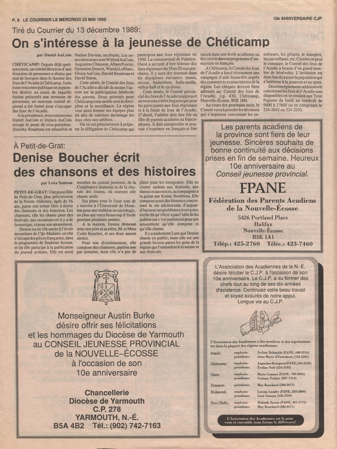 Le Courrier is Nova Scotia's leading French-language newspaper, and the only one with province-wide coverage and distribution. First published by Désiré d'Éon as Le Petit Courrier (Du Sud-Ouest de la Nouvelle-Écosse) on 10 February 1937, it has appeared weekly ever since, informing its readers, defending the interests of Acadians and francophones, and providing a bridge linking all Acadian regions in the province. It offers community news and events, extended articles, advertisements, announcements, photographs and special supplements, all directed towards supporting Nova Scotia's large, dispersed and diversified Acadian population, its businesses, industries, economy, daily activities, schools and higher education, politics, cultural life and heritage. Le Courrier offers an outstanding and unparalleled perspective on 66 years' accumulated history of Nova Scotia's Acadian population, thus enabling exploration of interests, activities, accomplishments, concerns and community issues across a broad swath of the 20th century.