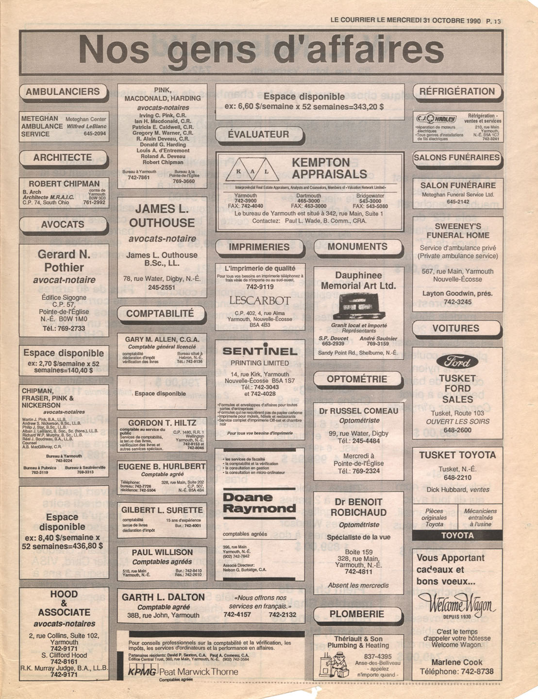 Le Courrier is Nova Scotia's leading French-language newspaper, and the only one with province-wide coverage and distribution. First published by Désiré d'Éon as Le Petit Courrier (Du Sud-Ouest de la Nouvelle-Écosse) on 10 February 1937, it has appeared weekly ever since, informing its readers, defending the interests of Acadians and francophones, and providing a bridge linking all Acadian regions in the province. It offers community news and events, extended articles, advertisements, announcements, photographs and special supplements, all directed towards supporting Nova Scotia's large, dispersed and diversified Acadian population, its businesses, industries, economy, daily activities, schools and higher education, politics, cultural life and heritage. Le Courrier offers an outstanding and unparalleled perspective on 66 years' accumulated history of Nova Scotia's Acadian population, thus enabling exploration of interests, activities, accomplishments, concerns and community issues across a broad swath of the 20th century.