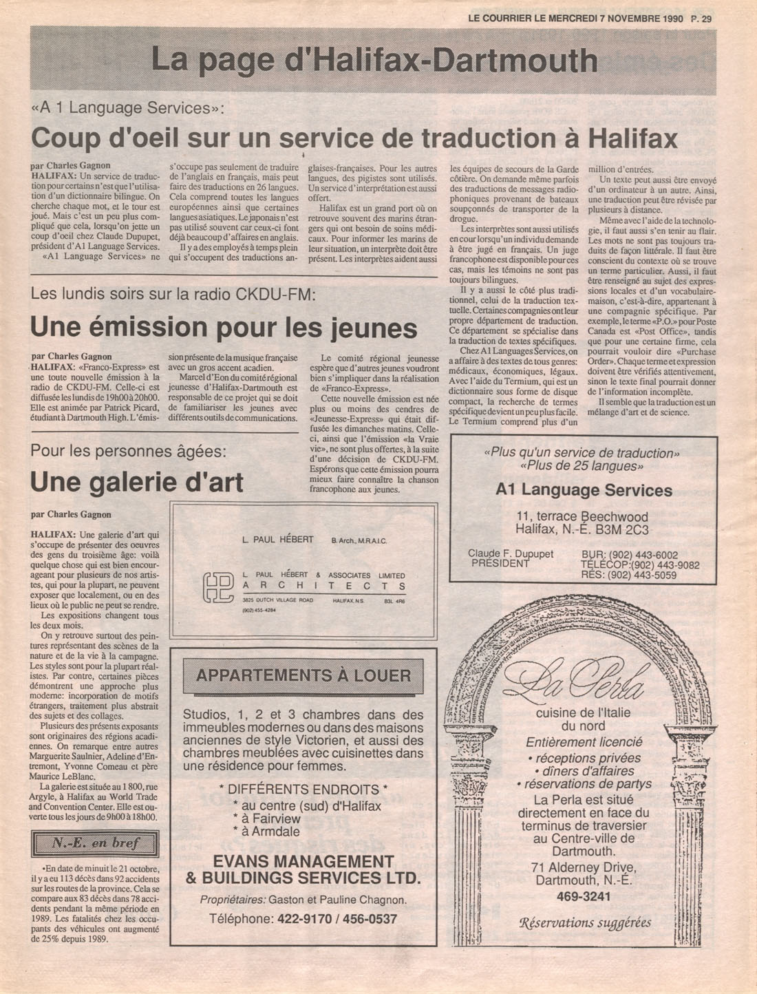 Le Courrier is Nova Scotia's leading French-language newspaper, and the only one with province-wide coverage and distribution. First published by Désiré d'Éon as Le Petit Courrier (Du Sud-Ouest de la Nouvelle-Écosse) on 10 February 1937, it has appeared weekly ever since, informing its readers, defending the interests of Acadians and francophones, and providing a bridge linking all Acadian regions in the province. It offers community news and events, extended articles, advertisements, announcements, photographs and special supplements, all directed towards supporting Nova Scotia's large, dispersed and diversified Acadian population, its businesses, industries, economy, daily activities, schools and higher education, politics, cultural life and heritage. Le Courrier offers an outstanding and unparalleled perspective on 66 years' accumulated history of Nova Scotia's Acadian population, thus enabling exploration of interests, activities, accomplishments, concerns and community issues across a broad swath of the 20th century.