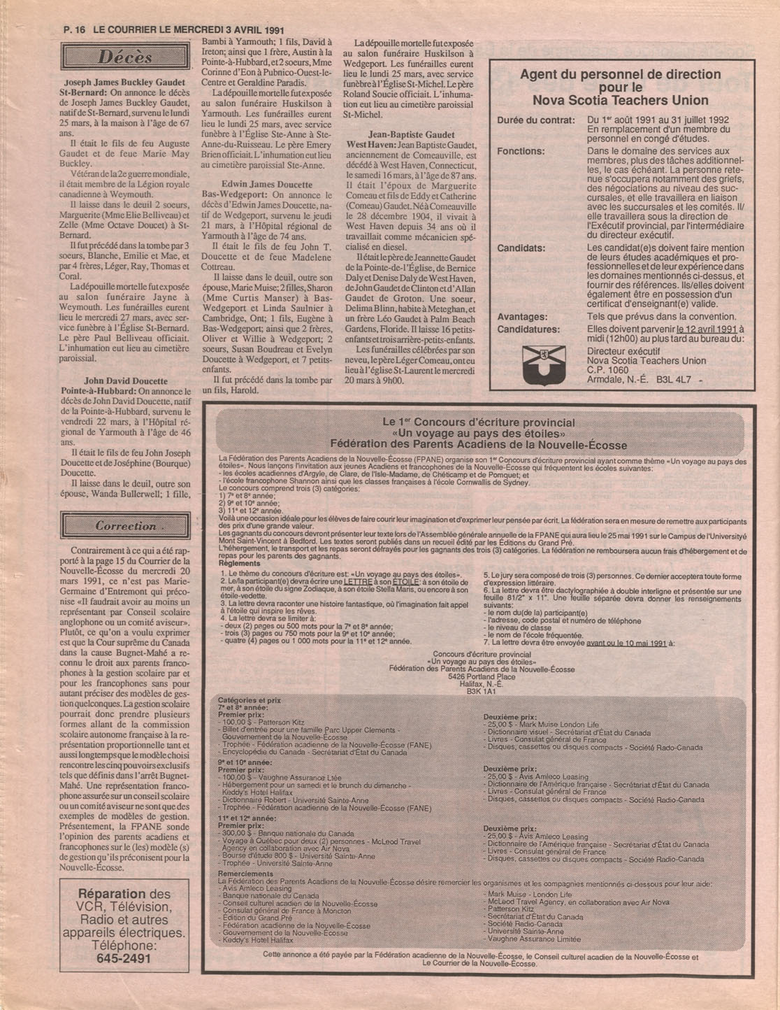 Le Courrier is Nova Scotia's leading French-language newspaper, and the only one with province-wide coverage and distribution. First published by Désiré d'Éon as Le Petit Courrier (Du Sud-Ouest de la Nouvelle-Écosse) on 10 February 1937, it has appeared weekly ever since, informing its readers, defending the interests of Acadians and francophones, and providing a bridge linking all Acadian regions in the province. It offers community news and events, extended articles, advertisements, announcements, photographs and special supplements, all directed towards supporting Nova Scotia's large, dispersed and diversified Acadian population, its businesses, industries, economy, daily activities, schools and higher education, politics, cultural life and heritage. Le Courrier offers an outstanding and unparalleled perspective on 66 years' accumulated history of Nova Scotia's Acadian population, thus enabling exploration of interests, activities, accomplishments, concerns and community issues across a broad swath of the 20th century.