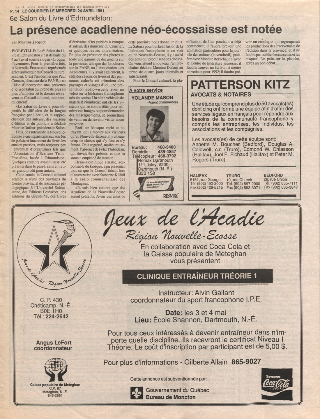Le Courrier is Nova Scotia's leading French-language newspaper, and the only one with province-wide coverage and distribution. First published by Désiré d'Éon as Le Petit Courrier (Du Sud-Ouest de la Nouvelle-Écosse) on 10 February 1937, it has appeared weekly ever since, informing its readers, defending the interests of Acadians and francophones, and providing a bridge linking all Acadian regions in the province. It offers community news and events, extended articles, advertisements, announcements, photographs and special supplements, all directed towards supporting Nova Scotia's large, dispersed and diversified Acadian population, its businesses, industries, economy, daily activities, schools and higher education, politics, cultural life and heritage. Le Courrier offers an outstanding and unparalleled perspective on 66 years' accumulated history of Nova Scotia's Acadian population, thus enabling exploration of interests, activities, accomplishments, concerns and community issues across a broad swath of the 20th century.