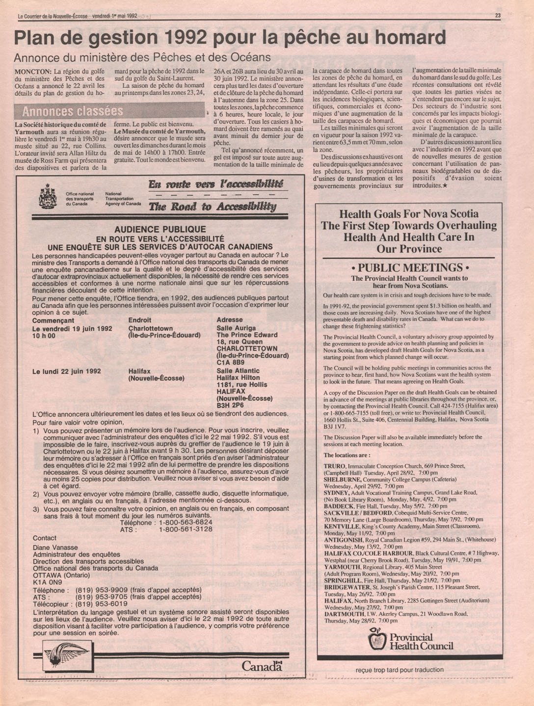 Le Courrier is Nova Scotia's leading French-language newspaper, and the only one with province-wide coverage and distribution. First published by Désiré d'Éon as Le Petit Courrier (Du Sud-Ouest de la Nouvelle-Écosse) on 10 February 1937, it has appeared weekly ever since, informing its readers, defending the interests of Acadians and francophones, and providing a bridge linking all Acadian regions in the province. It offers community news and events, extended articles, advertisements, announcements, photographs and special supplements, all directed towards supporting Nova Scotia's large, dispersed and diversified Acadian population, its businesses, industries, economy, daily activities, schools and higher education, politics, cultural life and heritage. Le Courrier offers an outstanding and unparalleled perspective on 66 years' accumulated history of Nova Scotia's Acadian population, thus enabling exploration of interests, activities, accomplishments, concerns and community issues across a broad swath of the 20th century.