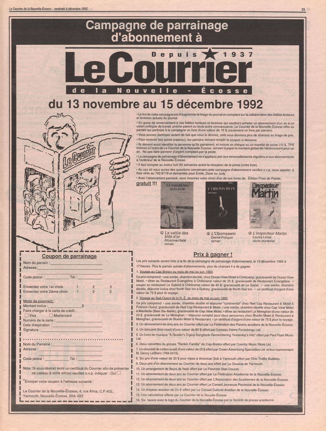 Le Courrier is Nova Scotia's leading French-language newspaper, and the only one with province-wide coverage and distribution. First published by Désiré d'Éon as Le Petit Courrier (Du Sud-Ouest de la Nouvelle-Écosse) on 10 February 1937, it has appeared weekly ever since, informing its readers, defending the interests of Acadians and francophones, and providing a bridge linking all Acadian regions in the province. It offers community news and events, extended articles, advertisements, announcements, photographs and special supplements, all directed towards supporting Nova Scotia's large, dispersed and diversified Acadian population, its businesses, industries, economy, daily activities, schools and higher education, politics, cultural life and heritage. Le Courrier offers an outstanding and unparalleled perspective on 66 years' accumulated history of Nova Scotia's Acadian population, thus enabling exploration of interests, activities, accomplishments, concerns and community issues across a broad swath of the 20th century.