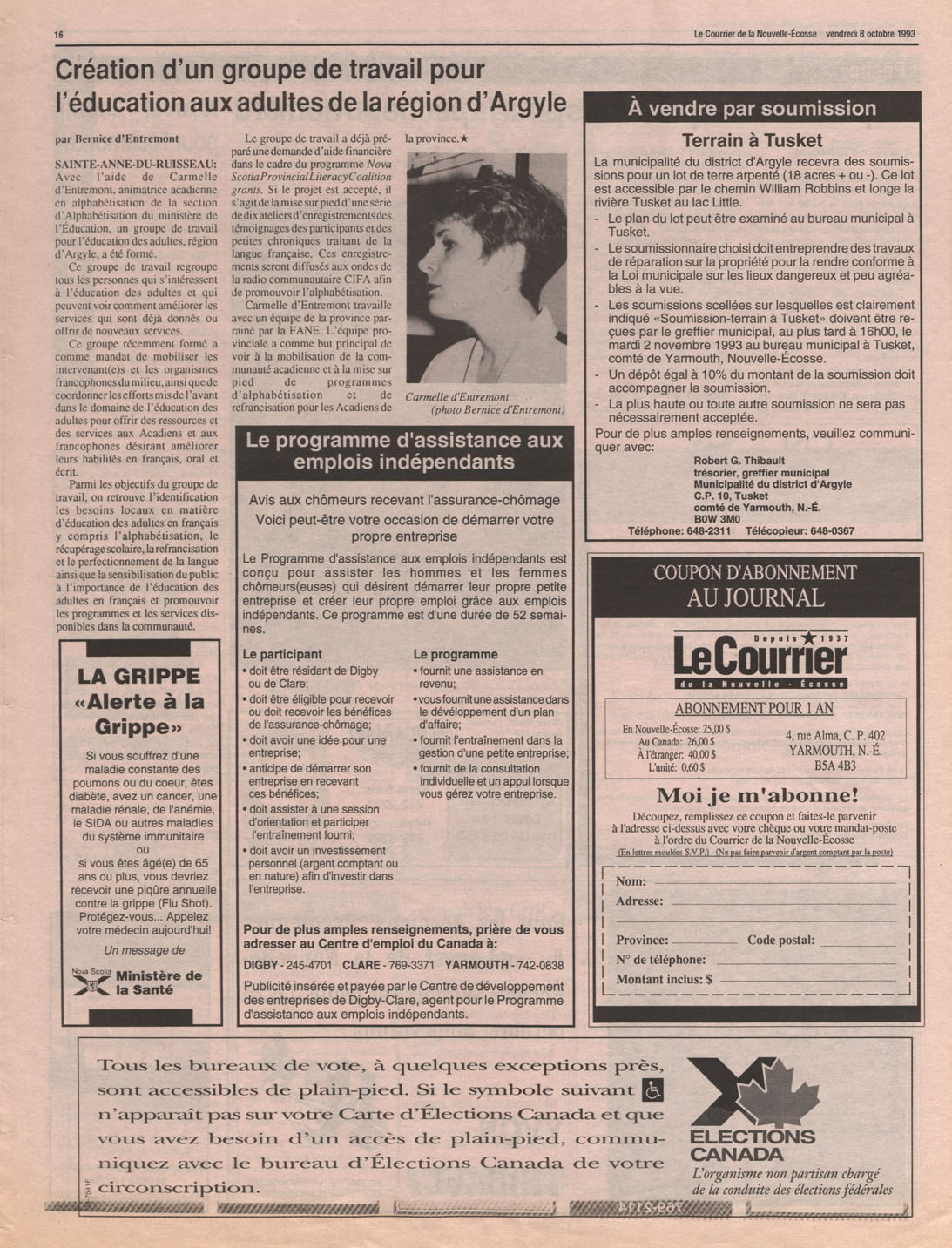 Le Courrier is Nova Scotia's leading French-language newspaper, and the only one with province-wide coverage and distribution. First published by Désiré d'Éon as Le Petit Courrier (Du Sud-Ouest de la Nouvelle-Écosse) on 10 February 1937, it has appeared weekly ever since, informing its readers, defending the interests of Acadians and francophones, and providing a bridge linking all Acadian regions in the province. It offers community news and events, extended articles, advertisements, announcements, photographs and special supplements, all directed towards supporting Nova Scotia's large, dispersed and diversified Acadian population, its businesses, industries, economy, daily activities, schools and higher education, politics, cultural life and heritage. Le Courrier offers an outstanding and unparalleled perspective on 66 years' accumulated history of Nova Scotia's Acadian population, thus enabling exploration of interests, activities, accomplishments, concerns and community issues across a broad swath of the 20th century.