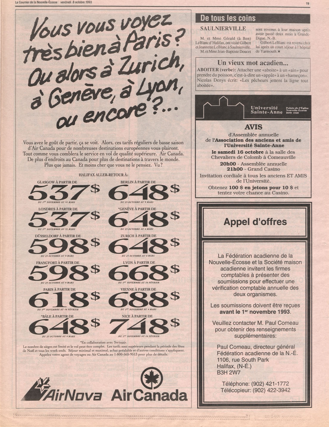 Le Courrier is Nova Scotia's leading French-language newspaper, and the only one with province-wide coverage and distribution. First published by Désiré d'Éon as Le Petit Courrier (Du Sud-Ouest de la Nouvelle-Écosse) on 10 February 1937, it has appeared weekly ever since, informing its readers, defending the interests of Acadians and francophones, and providing a bridge linking all Acadian regions in the province. It offers community news and events, extended articles, advertisements, announcements, photographs and special supplements, all directed towards supporting Nova Scotia's large, dispersed and diversified Acadian population, its businesses, industries, economy, daily activities, schools and higher education, politics, cultural life and heritage. Le Courrier offers an outstanding and unparalleled perspective on 66 years' accumulated history of Nova Scotia's Acadian population, thus enabling exploration of interests, activities, accomplishments, concerns and community issues across a broad swath of the 20th century.