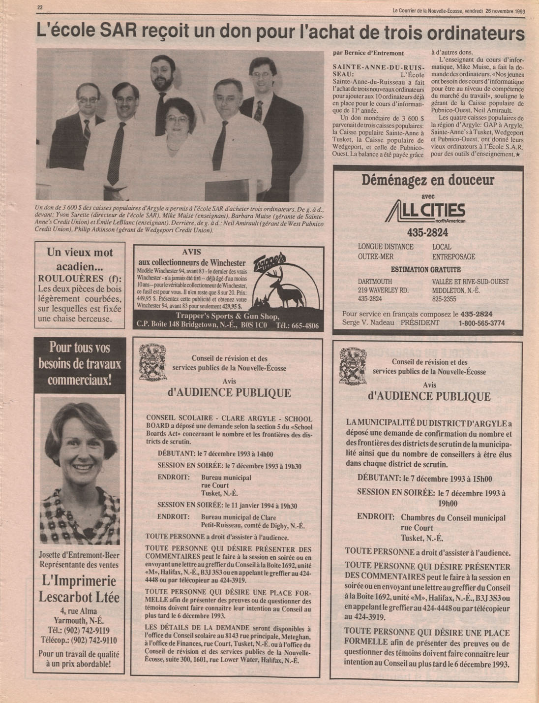 Le Courrier is Nova Scotia's leading French-language newspaper, and the only one with province-wide coverage and distribution. First published by Désiré d'Éon as Le Petit Courrier (Du Sud-Ouest de la Nouvelle-Écosse) on 10 February 1937, it has appeared weekly ever since, informing its readers, defending the interests of Acadians and francophones, and providing a bridge linking all Acadian regions in the province. It offers community news and events, extended articles, advertisements, announcements, photographs and special supplements, all directed towards supporting Nova Scotia's large, dispersed and diversified Acadian population, its businesses, industries, economy, daily activities, schools and higher education, politics, cultural life and heritage. Le Courrier offers an outstanding and unparalleled perspective on 66 years' accumulated history of Nova Scotia's Acadian population, thus enabling exploration of interests, activities, accomplishments, concerns and community issues across a broad swath of the 20th century.