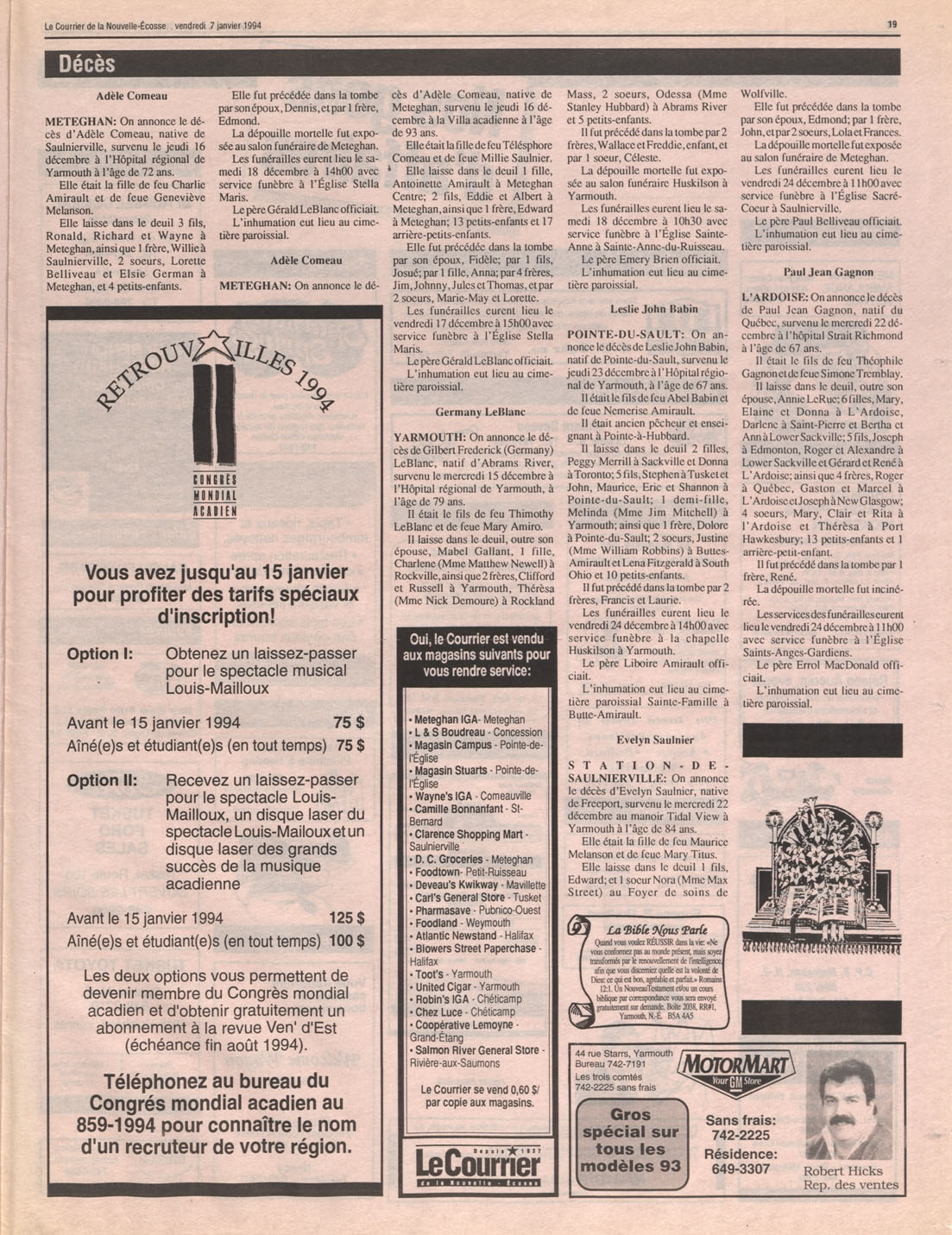 Le Courrier is Nova Scotia's leading French-language newspaper, and the only one with province-wide coverage and distribution. First published by Désiré d'Éon as Le Petit Courrier (Du Sud-Ouest de la Nouvelle-Écosse) on 10 February 1937, it has appeared weekly ever since, informing its readers, defending the interests of Acadians and francophones, and providing a bridge linking all Acadian regions in the province. It offers community news and events, extended articles, advertisements, announcements, photographs and special supplements, all directed towards supporting Nova Scotia's large, dispersed and diversified Acadian population, its businesses, industries, economy, daily activities, schools and higher education, politics, cultural life and heritage. Le Courrier offers an outstanding and unparalleled perspective on 66 years' accumulated history of Nova Scotia's Acadian population, thus enabling exploration of interests, activities, accomplishments, concerns and community issues across a broad swath of the 20th century.