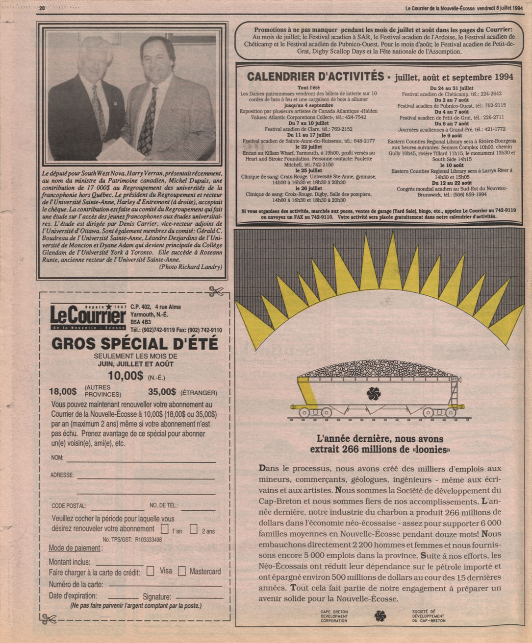 Le Courrier is Nova Scotia's leading French-language newspaper, and the only one with province-wide coverage and distribution. First published by Désiré d'Éon as Le Petit Courrier (Du Sud-Ouest de la Nouvelle-Écosse) on 10 February 1937, it has appeared weekly ever since, informing its readers, defending the interests of Acadians and francophones, and providing a bridge linking all Acadian regions in the province. It offers community news and events, extended articles, advertisements, announcements, photographs and special supplements, all directed towards supporting Nova Scotia's large, dispersed and diversified Acadian population, its businesses, industries, economy, daily activities, schools and higher education, politics, cultural life and heritage. Le Courrier offers an outstanding and unparalleled perspective on 66 years' accumulated history of Nova Scotia's Acadian population, thus enabling exploration of interests, activities, accomplishments, concerns and community issues across a broad swath of the 20th century.