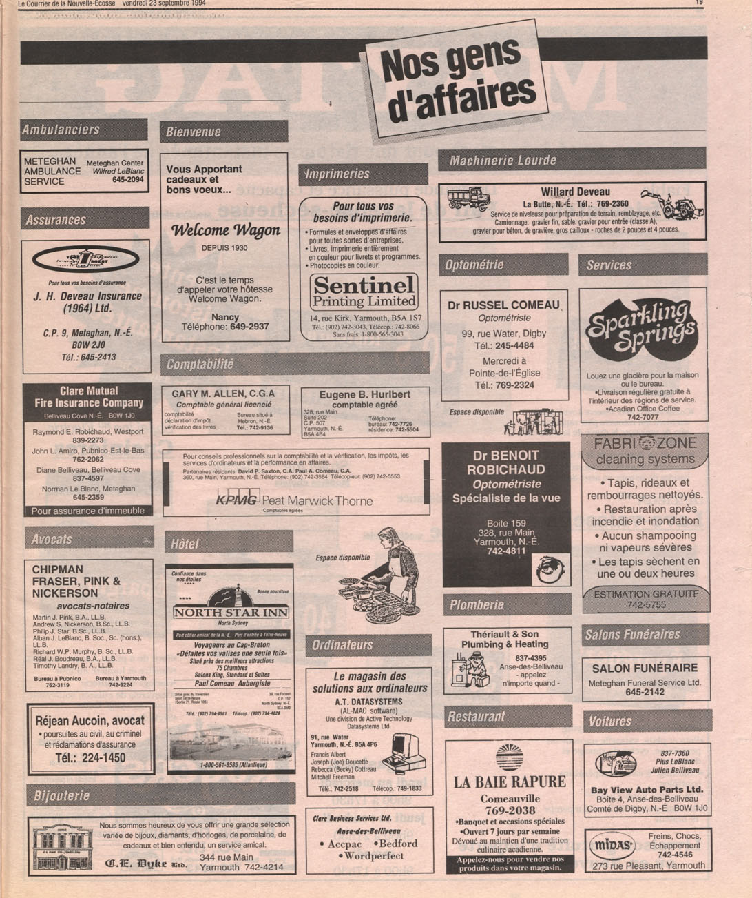 Le Courrier is Nova Scotia's leading French-language newspaper, and the only one with province-wide coverage and distribution. First published by Désiré d'Éon as Le Petit Courrier (Du Sud-Ouest de la Nouvelle-Écosse) on 10 February 1937, it has appeared weekly ever since, informing its readers, defending the interests of Acadians and francophones, and providing a bridge linking all Acadian regions in the province. It offers community news and events, extended articles, advertisements, announcements, photographs and special supplements, all directed towards supporting Nova Scotia's large, dispersed and diversified Acadian population, its businesses, industries, economy, daily activities, schools and higher education, politics, cultural life and heritage. Le Courrier offers an outstanding and unparalleled perspective on 66 years' accumulated history of Nova Scotia's Acadian population, thus enabling exploration of interests, activities, accomplishments, concerns and community issues across a broad swath of the 20th century.