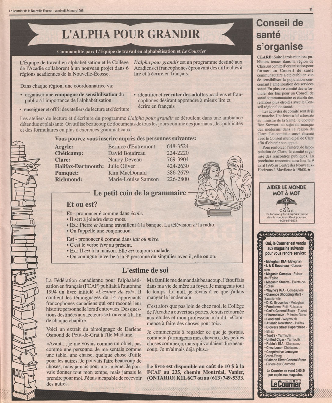 Le Courrier is Nova Scotia's leading French-language newspaper, and the only one with province-wide coverage and distribution. First published by Désiré d'Éon as Le Petit Courrier (Du Sud-Ouest de la Nouvelle-Écosse) on 10 February 1937, it has appeared weekly ever since, informing its readers, defending the interests of Acadians and francophones, and providing a bridge linking all Acadian regions in the province. It offers community news and events, extended articles, advertisements, announcements, photographs and special supplements, all directed towards supporting Nova Scotia's large, dispersed and diversified Acadian population, its businesses, industries, economy, daily activities, schools and higher education, politics, cultural life and heritage. Le Courrier offers an outstanding and unparalleled perspective on 66 years' accumulated history of Nova Scotia's Acadian population, thus enabling exploration of interests, activities, accomplishments, concerns and community issues across a broad swath of the 20th century.