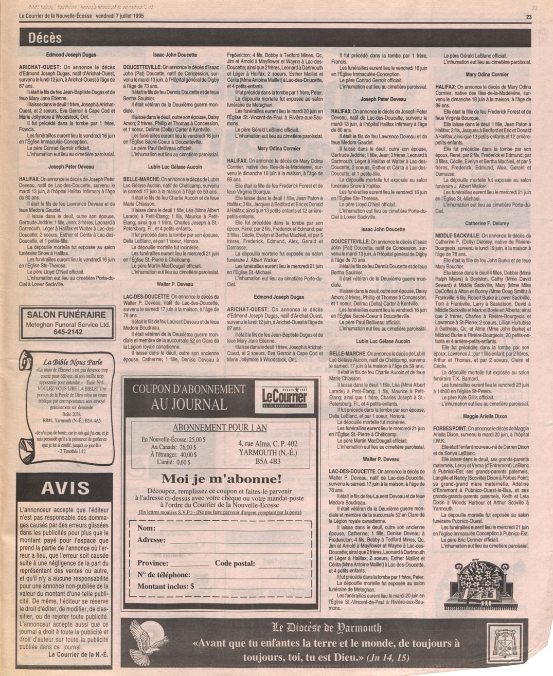 Le Courrier is Nova Scotia's leading French-language newspaper, and the only one with province-wide coverage and distribution. First published by Désiré d'Éon as Le Petit Courrier (Du Sud-Ouest de la Nouvelle-Écosse) on 10 February 1937, it has appeared weekly ever since, informing its readers, defending the interests of Acadians and francophones, and providing a bridge linking all Acadian regions in the province. It offers community news and events, extended articles, advertisements, announcements, photographs and special supplements, all directed towards supporting Nova Scotia's large, dispersed and diversified Acadian population, its businesses, industries, economy, daily activities, schools and higher education, politics, cultural life and heritage. Le Courrier offers an outstanding and unparalleled perspective on 66 years' accumulated history of Nova Scotia's Acadian population, thus enabling exploration of interests, activities, accomplishments, concerns and community issues across a broad swath of the 20th century.