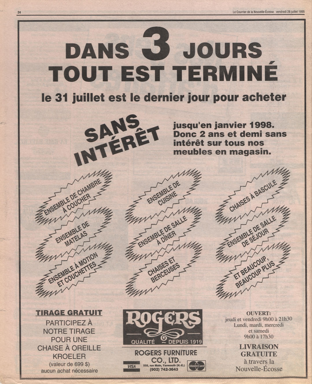 Le Courrier is Nova Scotia's leading French-language newspaper, and the only one with province-wide coverage and distribution. First published by Désiré d'Éon as Le Petit Courrier (Du Sud-Ouest de la Nouvelle-Écosse) on 10 February 1937, it has appeared weekly ever since, informing its readers, defending the interests of Acadians and francophones, and providing a bridge linking all Acadian regions in the province. It offers community news and events, extended articles, advertisements, announcements, photographs and special supplements, all directed towards supporting Nova Scotia's large, dispersed and diversified Acadian population, its businesses, industries, economy, daily activities, schools and higher education, politics, cultural life and heritage. Le Courrier offers an outstanding and unparalleled perspective on 66 years' accumulated history of Nova Scotia's Acadian population, thus enabling exploration of interests, activities, accomplishments, concerns and community issues across a broad swath of the 20th century.
