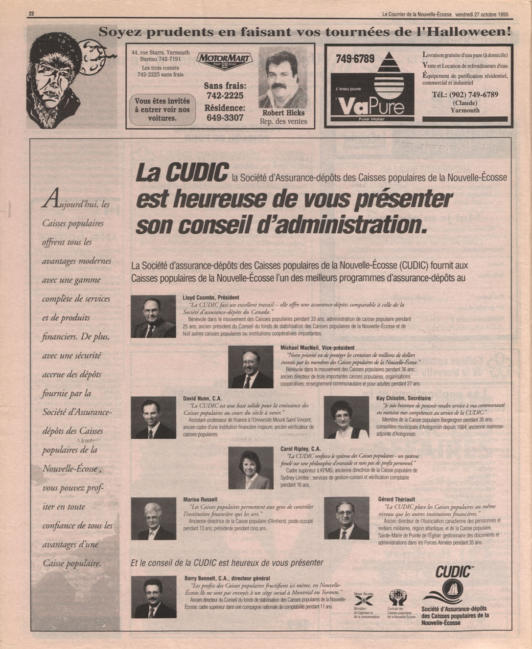 Le Courrier is Nova Scotia's leading French-language newspaper, and the only one with province-wide coverage and distribution. First published by Désiré d'Éon as Le Petit Courrier (Du Sud-Ouest de la Nouvelle-Écosse) on 10 February 1937, it has appeared weekly ever since, informing its readers, defending the interests of Acadians and francophones, and providing a bridge linking all Acadian regions in the province. It offers community news and events, extended articles, advertisements, announcements, photographs and special supplements, all directed towards supporting Nova Scotia's large, dispersed and diversified Acadian population, its businesses, industries, economy, daily activities, schools and higher education, politics, cultural life and heritage. Le Courrier offers an outstanding and unparalleled perspective on 66 years' accumulated history of Nova Scotia's Acadian population, thus enabling exploration of interests, activities, accomplishments, concerns and community issues across a broad swath of the 20th century.