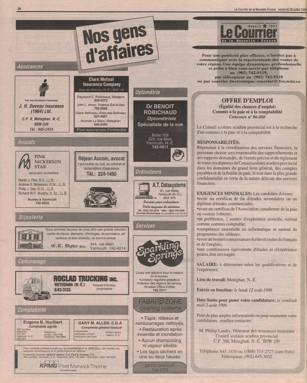 Le Courrier is Nova Scotia's leading French-language newspaper, and the only one with province-wide coverage and distribution. First published by Désiré d'Éon as Le Petit Courrier (Du Sud-Ouest de la Nouvelle-Écosse) on 10 February 1937, it has appeared weekly ever since, informing its readers, defending the interests of Acadians and francophones, and providing a bridge linking all Acadian regions in the province. It offers community news and events, extended articles, advertisements, announcements, photographs and special supplements, all directed towards supporting Nova Scotia's large, dispersed and diversified Acadian population, its businesses, industries, economy, daily activities, schools and higher education, politics, cultural life and heritage. Le Courrier offers an outstanding and unparalleled perspective on 66 years' accumulated history of Nova Scotia's Acadian population, thus enabling exploration of interests, activities, accomplishments, concerns and community issues across a broad swath of the 20th century.