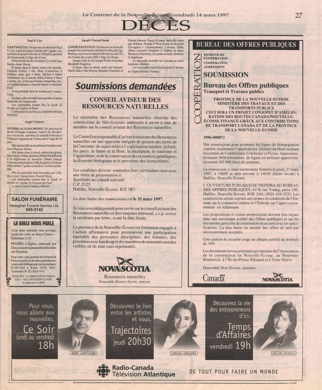 Le Courrier is Nova Scotia's leading French-language newspaper, and the only one with province-wide coverage and distribution. First published by Désiré d'Éon as Le Petit Courrier (Du Sud-Ouest de la Nouvelle-Écosse) on 10 February 1937, it has appeared weekly ever since, informing its readers, defending the interests of Acadians and francophones, and providing a bridge linking all Acadian regions in the province. It offers community news and events, extended articles, advertisements, announcements, photographs and special supplements, all directed towards supporting Nova Scotia's large, dispersed and diversified Acadian population, its businesses, industries, economy, daily activities, schools and higher education, politics, cultural life and heritage. Le Courrier offers an outstanding and unparalleled perspective on 66 years' accumulated history of Nova Scotia's Acadian population, thus enabling exploration of interests, activities, accomplishments, concerns and community issues across a broad swath of the 20th century.
