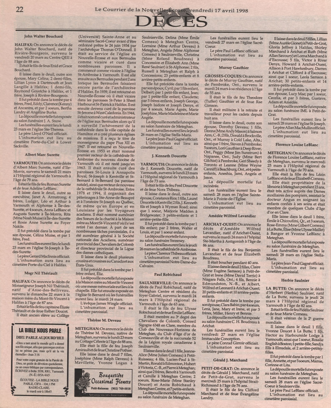 Le Courrier is Nova Scotia's leading French-language newspaper, and the only one with province-wide coverage and distribution. First published by Désiré d'Éon as Le Petit Courrier (Du Sud-Ouest de la Nouvelle-Écosse) on 10 February 1937, it has appeared weekly ever since, informing its readers, defending the interests of Acadians and francophones, and providing a bridge linking all Acadian regions in the province. It offers community news and events, extended articles, advertisements, announcements, photographs and special supplements, all directed towards supporting Nova Scotia's large, dispersed and diversified Acadian population, its businesses, industries, economy, daily activities, schools and higher education, politics, cultural life and heritage. Le Courrier offers an outstanding and unparalleled perspective on 66 years' accumulated history of Nova Scotia's Acadian population, thus enabling exploration of interests, activities, accomplishments, concerns and community issues across a broad swath of the 20th century.