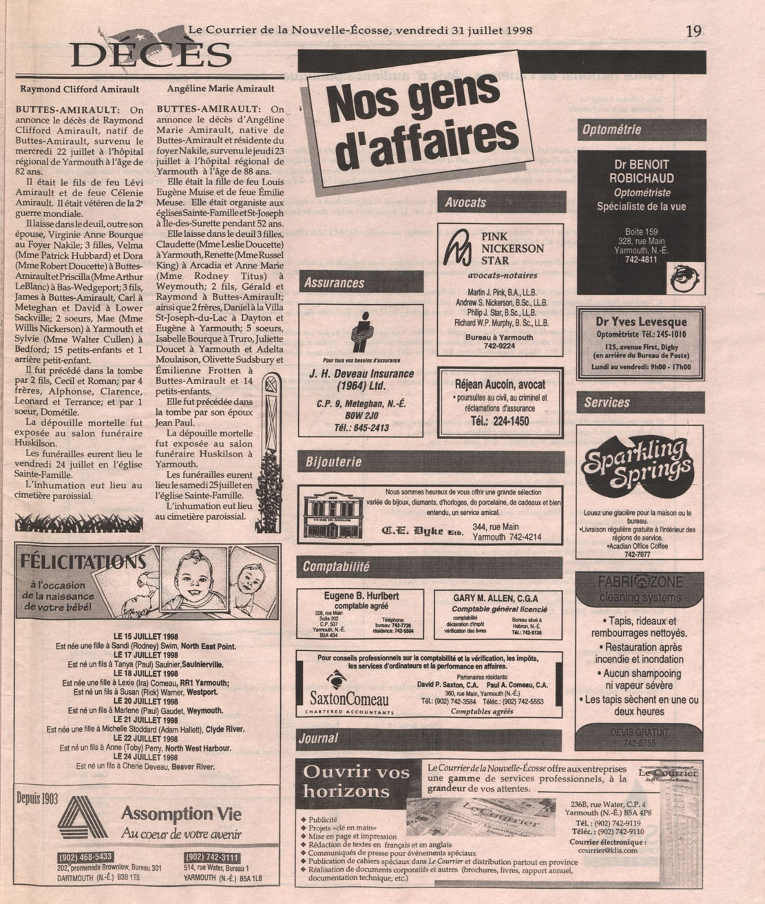 Le Courrier is Nova Scotia's leading French-language newspaper, and the only one with province-wide coverage and distribution. First published by Désiré d'Éon as Le Petit Courrier (Du Sud-Ouest de la Nouvelle-Écosse) on 10 February 1937, it has appeared weekly ever since, informing its readers, defending the interests of Acadians and francophones, and providing a bridge linking all Acadian regions in the province. It offers community news and events, extended articles, advertisements, announcements, photographs and special supplements, all directed towards supporting Nova Scotia's large, dispersed and diversified Acadian population, its businesses, industries, economy, daily activities, schools and higher education, politics, cultural life and heritage. Le Courrier offers an outstanding and unparalleled perspective on 66 years' accumulated history of Nova Scotia's Acadian population, thus enabling exploration of interests, activities, accomplishments, concerns and community issues across a broad swath of the 20th century.