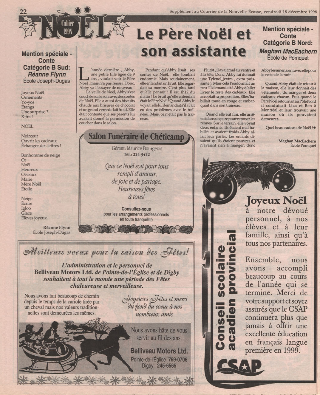 Le Courrier is Nova Scotia's leading French-language newspaper, and the only one with province-wide coverage and distribution. First published by Désiré d'Éon as Le Petit Courrier (Du Sud-Ouest de la Nouvelle-Écosse) on 10 February 1937, it has appeared weekly ever since, informing its readers, defending the interests of Acadians and francophones, and providing a bridge linking all Acadian regions in the province. It offers community news and events, extended articles, advertisements, announcements, photographs and special supplements, all directed towards supporting Nova Scotia's large, dispersed and diversified Acadian population, its businesses, industries, economy, daily activities, schools and higher education, politics, cultural life and heritage. Le Courrier offers an outstanding and unparalleled perspective on 66 years' accumulated history of Nova Scotia's Acadian population, thus enabling exploration of interests, activities, accomplishments, concerns and community issues across a broad swath of the 20th century.
