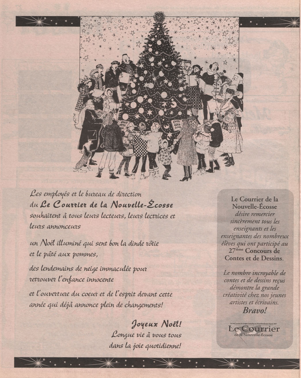 Le Courrier is Nova Scotia's leading French-language newspaper, and the only one with province-wide coverage and distribution. First published by Désiré d'Éon as Le Petit Courrier (Du Sud-Ouest de la Nouvelle-Écosse) on 10 February 1937, it has appeared weekly ever since, informing its readers, defending the interests of Acadians and francophones, and providing a bridge linking all Acadian regions in the province. It offers community news and events, extended articles, advertisements, announcements, photographs and special supplements, all directed towards supporting Nova Scotia's large, dispersed and diversified Acadian population, its businesses, industries, economy, daily activities, schools and higher education, politics, cultural life and heritage. Le Courrier offers an outstanding and unparalleled perspective on 66 years' accumulated history of Nova Scotia's Acadian population, thus enabling exploration of interests, activities, accomplishments, concerns and community issues across a broad swath of the 20th century.