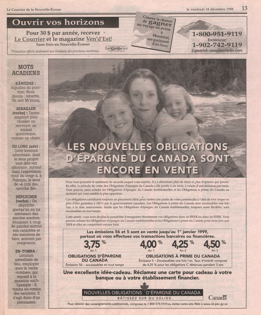 Le Courrier is Nova Scotia's leading French-language newspaper, and the only one with province-wide coverage and distribution. First published by Désiré d'Éon as Le Petit Courrier (Du Sud-Ouest de la Nouvelle-Écosse) on 10 February 1937, it has appeared weekly ever since, informing its readers, defending the interests of Acadians and francophones, and providing a bridge linking all Acadian regions in the province. It offers community news and events, extended articles, advertisements, announcements, photographs and special supplements, all directed towards supporting Nova Scotia's large, dispersed and diversified Acadian population, its businesses, industries, economy, daily activities, schools and higher education, politics, cultural life and heritage. Le Courrier offers an outstanding and unparalleled perspective on 66 years' accumulated history of Nova Scotia's Acadian population, thus enabling exploration of interests, activities, accomplishments, concerns and community issues across a broad swath of the 20th century.
