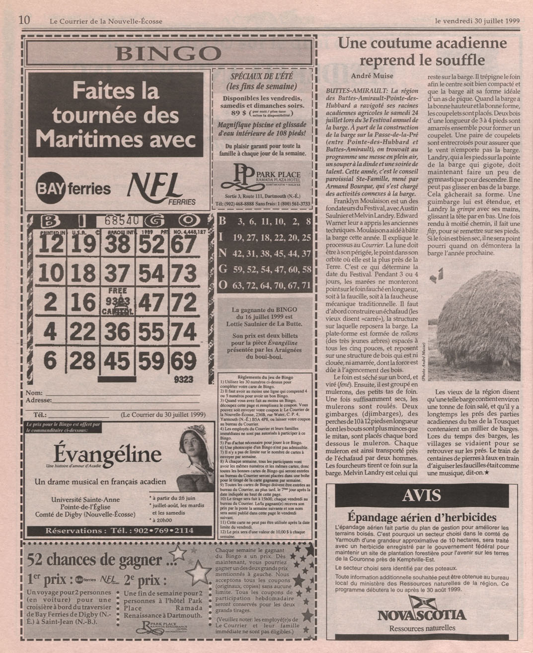 Le Courrier is Nova Scotia's leading French-language newspaper, and the only one with province-wide coverage and distribution. First published by Désiré d'Éon as Le Petit Courrier (Du Sud-Ouest de la Nouvelle-Écosse) on 10 February 1937, it has appeared weekly ever since, informing its readers, defending the interests of Acadians and francophones, and providing a bridge linking all Acadian regions in the province. It offers community news and events, extended articles, advertisements, announcements, photographs and special supplements, all directed towards supporting Nova Scotia's large, dispersed and diversified Acadian population, its businesses, industries, economy, daily activities, schools and higher education, politics, cultural life and heritage. Le Courrier offers an outstanding and unparalleled perspective on 66 years' accumulated history of Nova Scotia's Acadian population, thus enabling exploration of interests, activities, accomplishments, concerns and community issues across a broad swath of the 20th century.