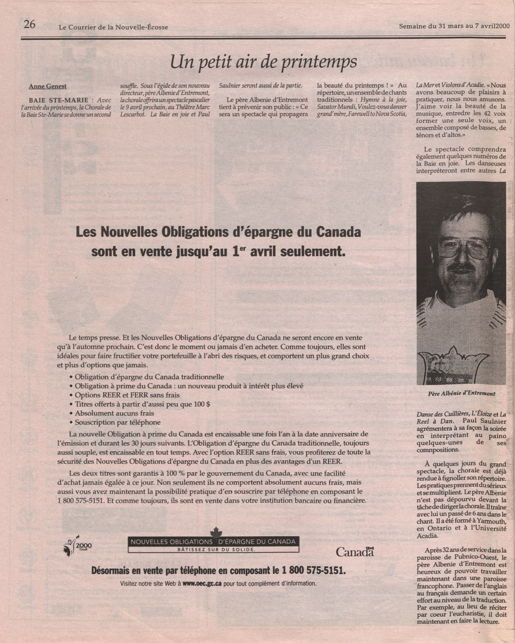 Le Courrier is Nova Scotia's leading French-language newspaper, and the only one with province-wide coverage and distribution. First published by Désiré d'Éon as Le Petit Courrier (Du Sud-Ouest de la Nouvelle-Écosse) on 10 February 1937, it has appeared weekly ever since, informing its readers, defending the interests of Acadians and francophones, and providing a bridge linking all Acadian regions in the province. It offers community news and events, extended articles, advertisements, announcements, photographs and special supplements, all directed towards supporting Nova Scotia's large, dispersed and diversified Acadian population, its businesses, industries, economy, daily activities, schools and higher education, politics, cultural life and heritage. Le Courrier offers an outstanding and unparalleled perspective on 66 years' accumulated history of Nova Scotia's Acadian population, thus enabling exploration of interests, activities, accomplishments, concerns and community issues across a broad swath of the 20th century.