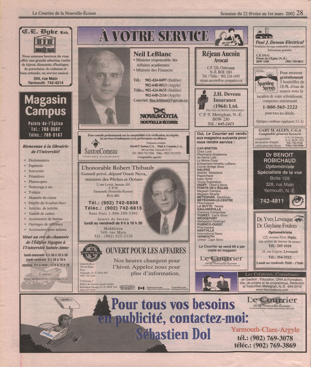 Le Courrier is Nova Scotia's leading French-language newspaper, and the only one with province-wide coverage and distribution. First published by Désiré d'Éon as Le Petit Courrier (Du Sud-Ouest de la Nouvelle-Écosse) on 10 February 1937, it has appeared weekly ever since, informing its readers, defending the interests of Acadians and francophones, and providing a bridge linking all Acadian regions in the province. It offers community news and events, extended articles, advertisements, announcements, photographs and special supplements, all directed towards supporting Nova Scotia's large, dispersed and diversified Acadian population, its businesses, industries, economy, daily activities, schools and higher education, politics, cultural life and heritage. Le Courrier offers an outstanding and unparalleled perspective on 66 years' accumulated history of Nova Scotia's Acadian population, thus enabling exploration of interests, activities, accomplishments, concerns and community issues across a broad swath of the 20th century.