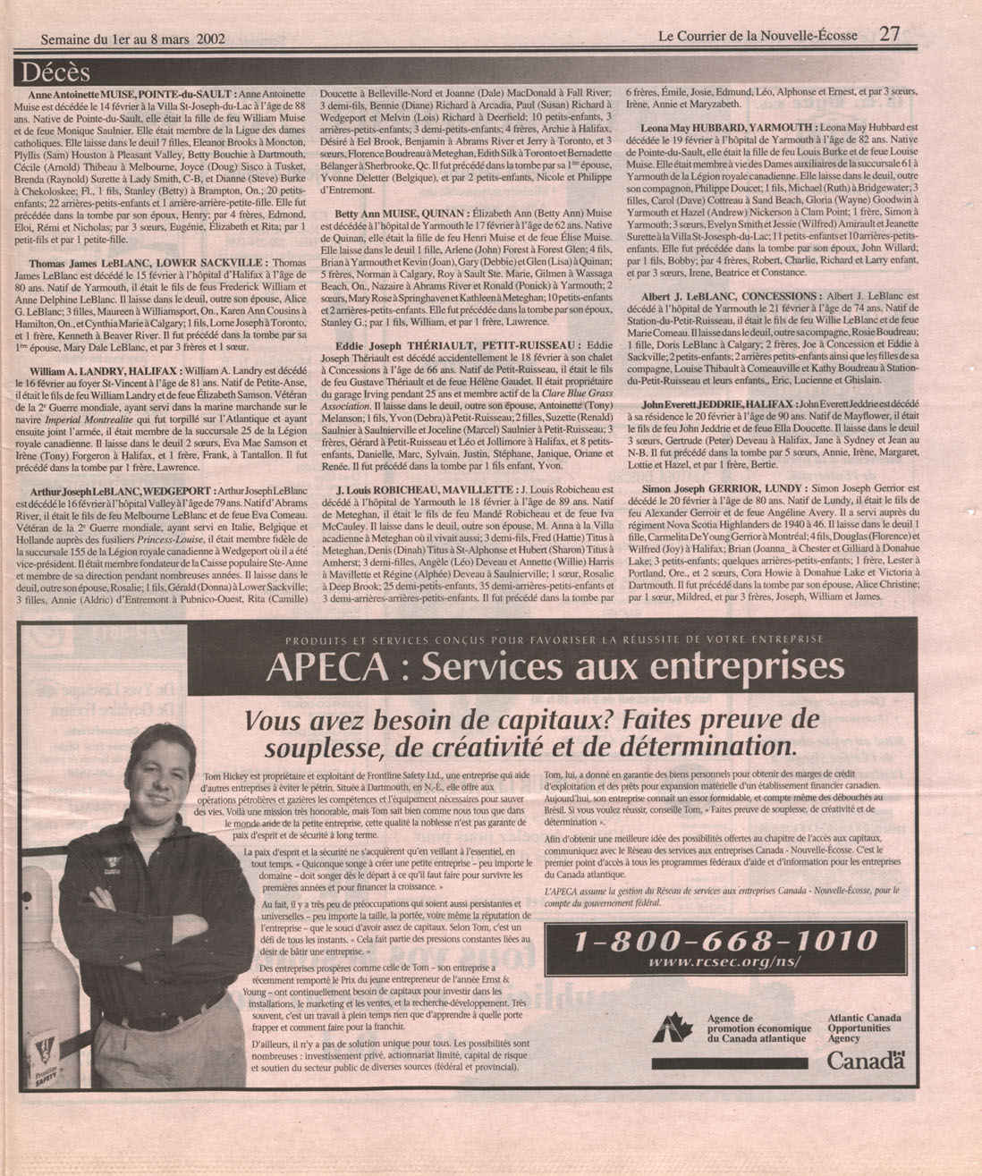 Le Courrier is Nova Scotia's leading French-language newspaper, and the only one with province-wide coverage and distribution. First published by Désiré d'Éon as Le Petit Courrier (Du Sud-Ouest de la Nouvelle-Écosse) on 10 February 1937, it has appeared weekly ever since, informing its readers, defending the interests of Acadians and francophones, and providing a bridge linking all Acadian regions in the province. It offers community news and events, extended articles, advertisements, announcements, photographs and special supplements, all directed towards supporting Nova Scotia's large, dispersed and diversified Acadian population, its businesses, industries, economy, daily activities, schools and higher education, politics, cultural life and heritage. Le Courrier offers an outstanding and unparalleled perspective on 66 years' accumulated history of Nova Scotia's Acadian population, thus enabling exploration of interests, activities, accomplishments, concerns and community issues across a broad swath of the 20th century.