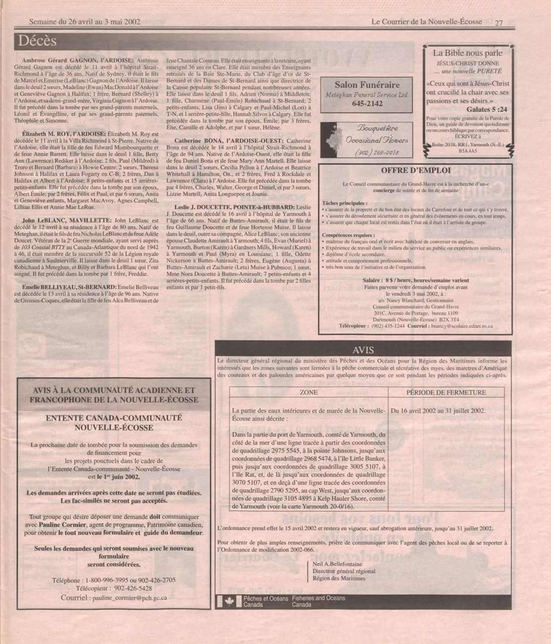 Le Courrier is Nova Scotia's leading French-language newspaper, and the only one with province-wide coverage and distribution. First published by Désiré d'Éon as Le Petit Courrier (Du Sud-Ouest de la Nouvelle-Écosse) on 10 February 1937, it has appeared weekly ever since, informing its readers, defending the interests of Acadians and francophones, and providing a bridge linking all Acadian regions in the province. It offers community news and events, extended articles, advertisements, announcements, photographs and special supplements, all directed towards supporting Nova Scotia's large, dispersed and diversified Acadian population, its businesses, industries, economy, daily activities, schools and higher education, politics, cultural life and heritage. Le Courrier offers an outstanding and unparalleled perspective on 66 years' accumulated history of Nova Scotia's Acadian population, thus enabling exploration of interests, activities, accomplishments, concerns and community issues across a broad swath of the 20th century.