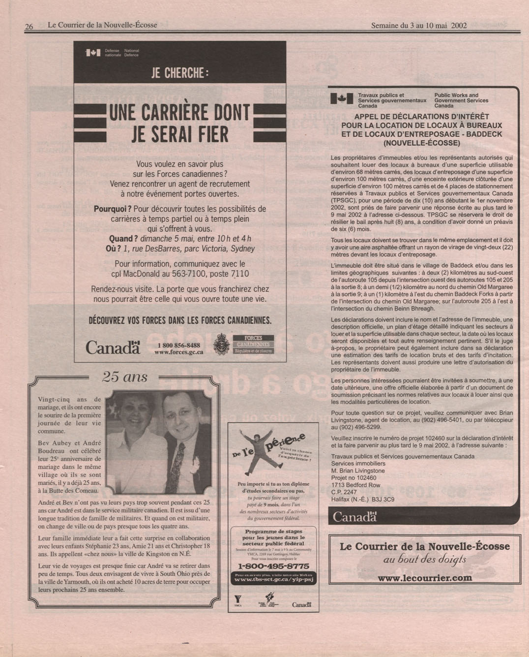 Le Courrier is Nova Scotia's leading French-language newspaper, and the only one with province-wide coverage and distribution. First published by Désiré d'Éon as Le Petit Courrier (Du Sud-Ouest de la Nouvelle-Écosse) on 10 February 1937, it has appeared weekly ever since, informing its readers, defending the interests of Acadians and francophones, and providing a bridge linking all Acadian regions in the province. It offers community news and events, extended articles, advertisements, announcements, photographs and special supplements, all directed towards supporting Nova Scotia's large, dispersed and diversified Acadian population, its businesses, industries, economy, daily activities, schools and higher education, politics, cultural life and heritage. Le Courrier offers an outstanding and unparalleled perspective on 66 years' accumulated history of Nova Scotia's Acadian population, thus enabling exploration of interests, activities, accomplishments, concerns and community issues across a broad swath of the 20th century.