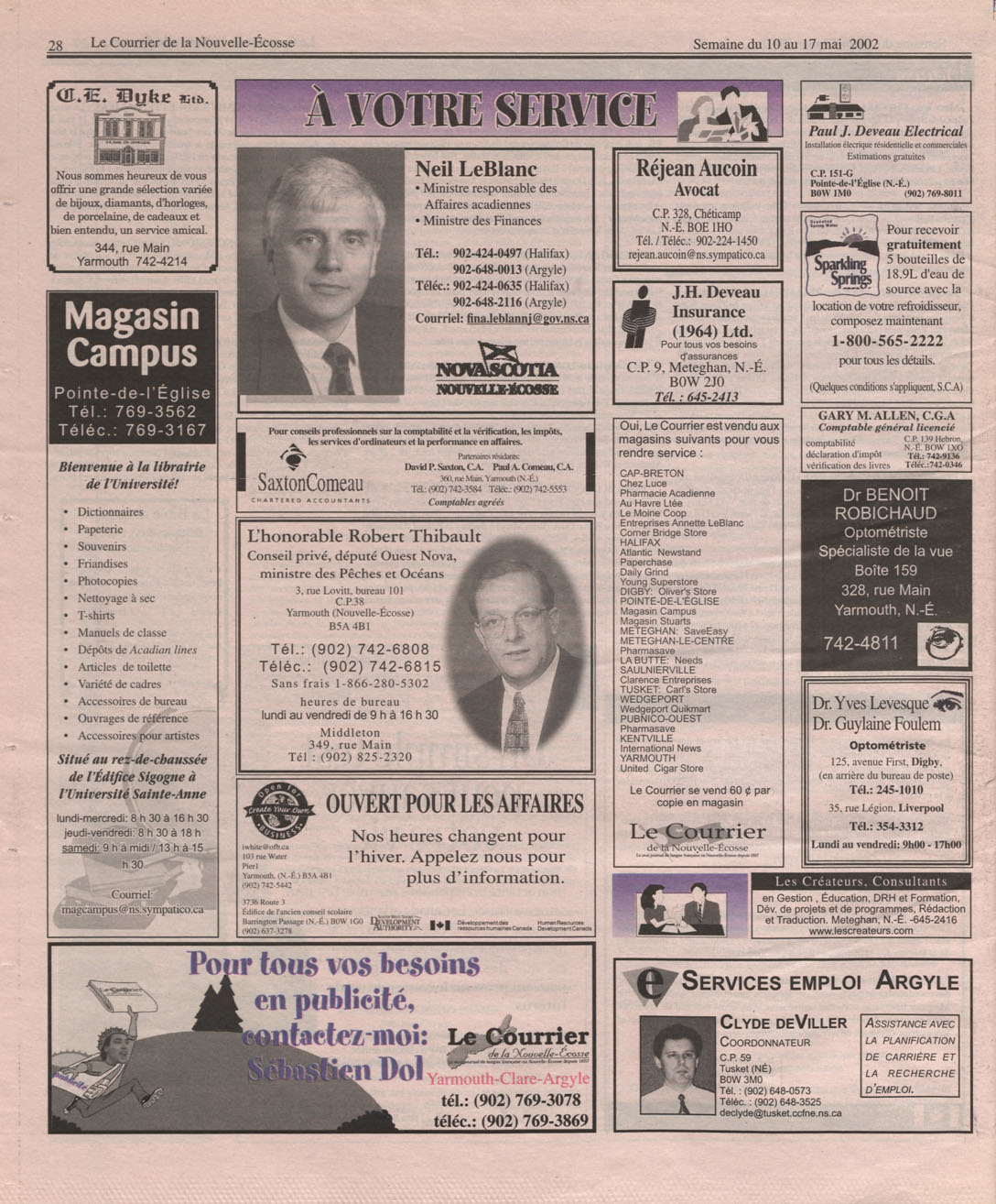 Le Courrier is Nova Scotia's leading French-language newspaper, and the only one with province-wide coverage and distribution. First published by Désiré d'Éon as Le Petit Courrier (Du Sud-Ouest de la Nouvelle-Écosse) on 10 February 1937, it has appeared weekly ever since, informing its readers, defending the interests of Acadians and francophones, and providing a bridge linking all Acadian regions in the province. It offers community news and events, extended articles, advertisements, announcements, photographs and special supplements, all directed towards supporting Nova Scotia's large, dispersed and diversified Acadian population, its businesses, industries, economy, daily activities, schools and higher education, politics, cultural life and heritage. Le Courrier offers an outstanding and unparalleled perspective on 66 years' accumulated history of Nova Scotia's Acadian population, thus enabling exploration of interests, activities, accomplishments, concerns and community issues across a broad swath of the 20th century.