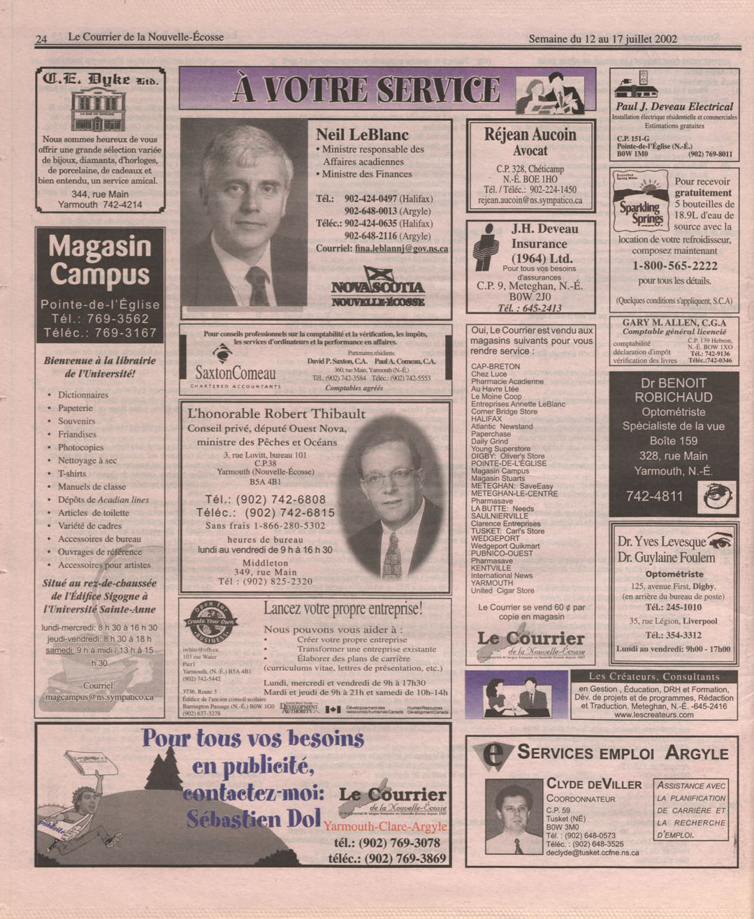 Le Courrier is Nova Scotia's leading French-language newspaper, and the only one with province-wide coverage and distribution. First published by Désiré d'Éon as Le Petit Courrier (Du Sud-Ouest de la Nouvelle-Écosse) on 10 February 1937, it has appeared weekly ever since, informing its readers, defending the interests of Acadians and francophones, and providing a bridge linking all Acadian regions in the province. It offers community news and events, extended articles, advertisements, announcements, photographs and special supplements, all directed towards supporting Nova Scotia's large, dispersed and diversified Acadian population, its businesses, industries, economy, daily activities, schools and higher education, politics, cultural life and heritage. Le Courrier offers an outstanding and unparalleled perspective on 66 years' accumulated history of Nova Scotia's Acadian population, thus enabling exploration of interests, activities, accomplishments, concerns and community issues across a broad swath of the 20th century.
