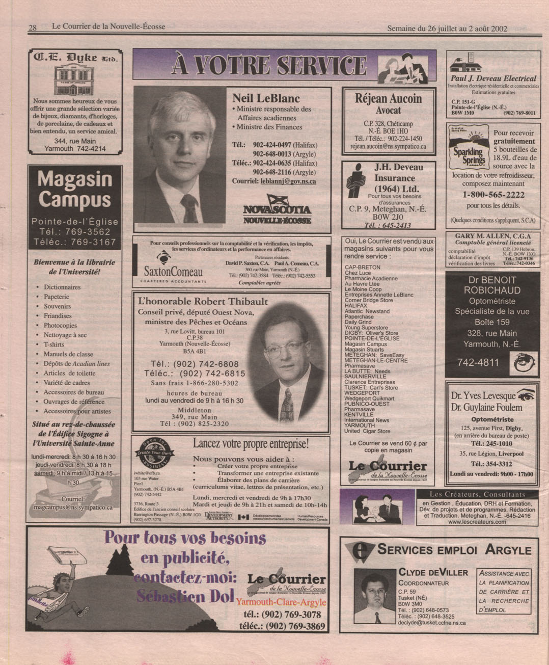 Le Courrier is Nova Scotia's leading French-language newspaper, and the only one with province-wide coverage and distribution. First published by Désiré d'Éon as Le Petit Courrier (Du Sud-Ouest de la Nouvelle-Écosse) on 10 February 1937, it has appeared weekly ever since, informing its readers, defending the interests of Acadians and francophones, and providing a bridge linking all Acadian regions in the province. It offers community news and events, extended articles, advertisements, announcements, photographs and special supplements, all directed towards supporting Nova Scotia's large, dispersed and diversified Acadian population, its businesses, industries, economy, daily activities, schools and higher education, politics, cultural life and heritage. Le Courrier offers an outstanding and unparalleled perspective on 66 years' accumulated history of Nova Scotia's Acadian population, thus enabling exploration of interests, activities, accomplishments, concerns and community issues across a broad swath of the 20th century.