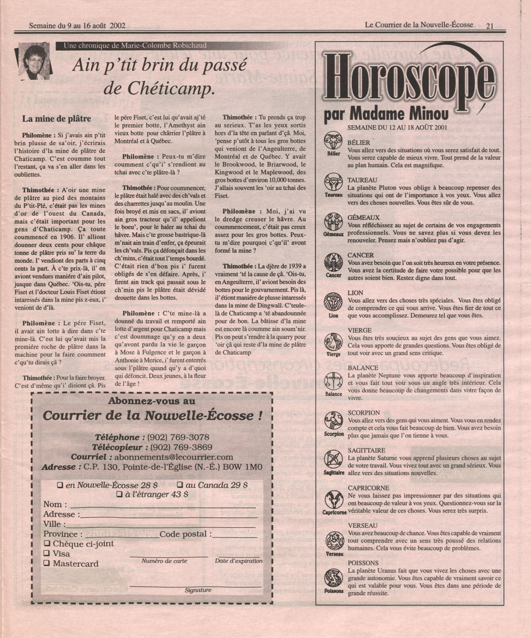 Le Courrier is Nova Scotia's leading French-language newspaper, and the only one with province-wide coverage and distribution. First published by Désiré d'Éon as Le Petit Courrier (Du Sud-Ouest de la Nouvelle-Écosse) on 10 February 1937, it has appeared weekly ever since, informing its readers, defending the interests of Acadians and francophones, and providing a bridge linking all Acadian regions in the province. It offers community news and events, extended articles, advertisements, announcements, photographs and special supplements, all directed towards supporting Nova Scotia's large, dispersed and diversified Acadian population, its businesses, industries, economy, daily activities, schools and higher education, politics, cultural life and heritage. Le Courrier offers an outstanding and unparalleled perspective on 66 years' accumulated history of Nova Scotia's Acadian population, thus enabling exploration of interests, activities, accomplishments, concerns and community issues across a broad swath of the 20th century.