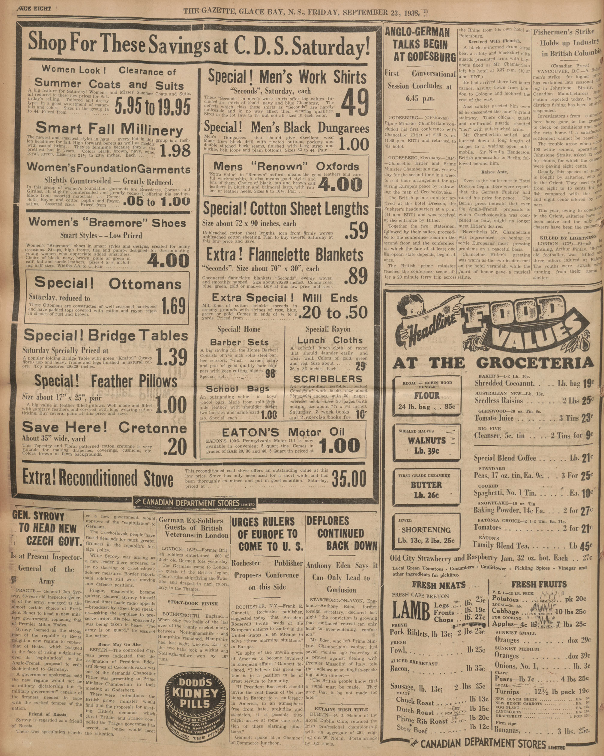The Gazette, Glace Bay, "Nova Scotia's Independent Newspaper" began as a daily in 1904. Published by the Gazette Publishing Company, its manager in 1909 was John Byrenton, who was replaced in 1923 by A.D. MacNeil. The Nova Scotia Archives is the only known repository with issues from 1937 to 1947. In August 1942 The Gazette was purchased by the coal miner's union and rebranded as the first newspaper in Canada to be "owned by the people for the people". Its editorial pages committed to telling the people's side of the story supporting the labour movements and Co-operative Commonwealth Federation (CCF).