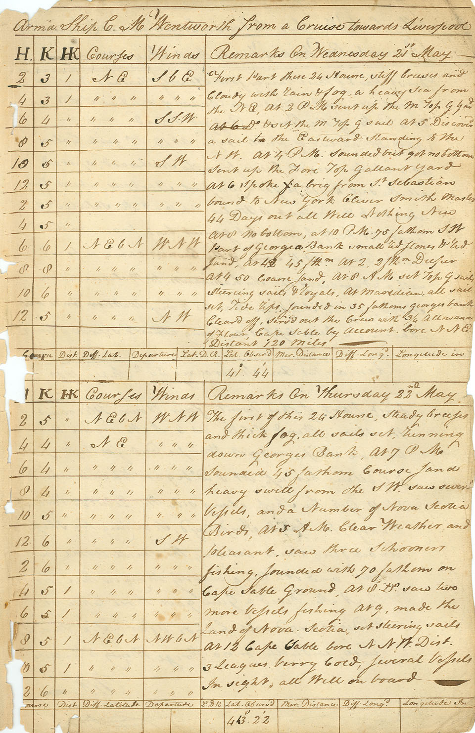 Her first three cruises into the Caribbean against the French and Spanish proved highly successful. Enough lucrative prizes were taken to give both owners and crew members a sizeable income. Prompted by this record of success, the Wentworth (named after the son of Nova Scotia's Lt. Governor, Sir John Wentworth) returned to sea again in November 1799, under the command of Captain Thomas Parker, a resident of Liverpool. On board were a crew mostly recruited from Nova Scotia's "south shore." Included in that contingent were six to eight black sailors, most likely people who had come to Nova Scotia during the Loyalist exodus from the new United States, some fifteen years earlier.