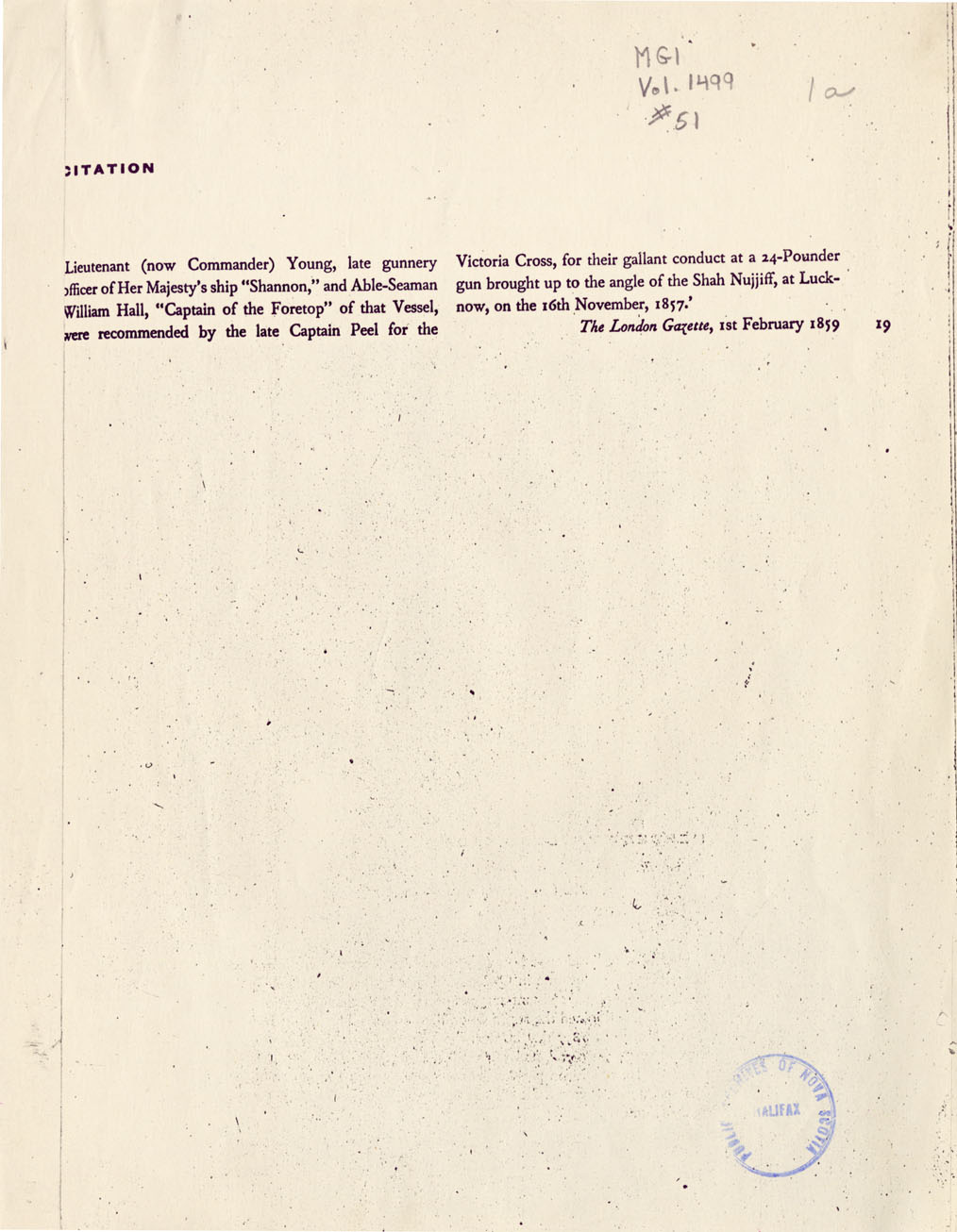 Reference William Hall, VC Nova Scotia Archives MG 1 volume 1499 number 51