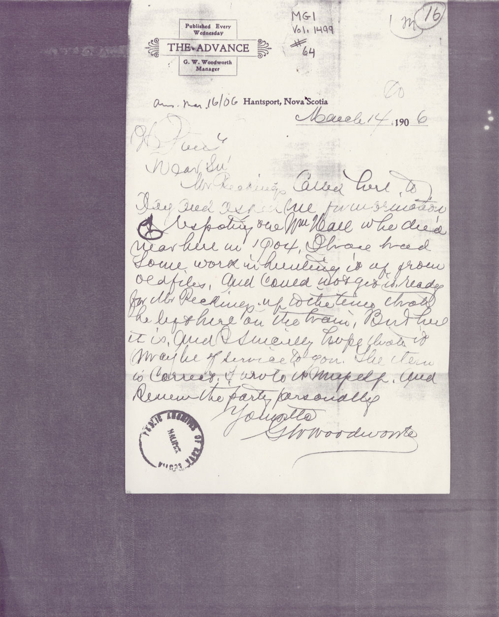 Letter from G.W. Woodworth, The Advance, Hantsport to Harry Piers