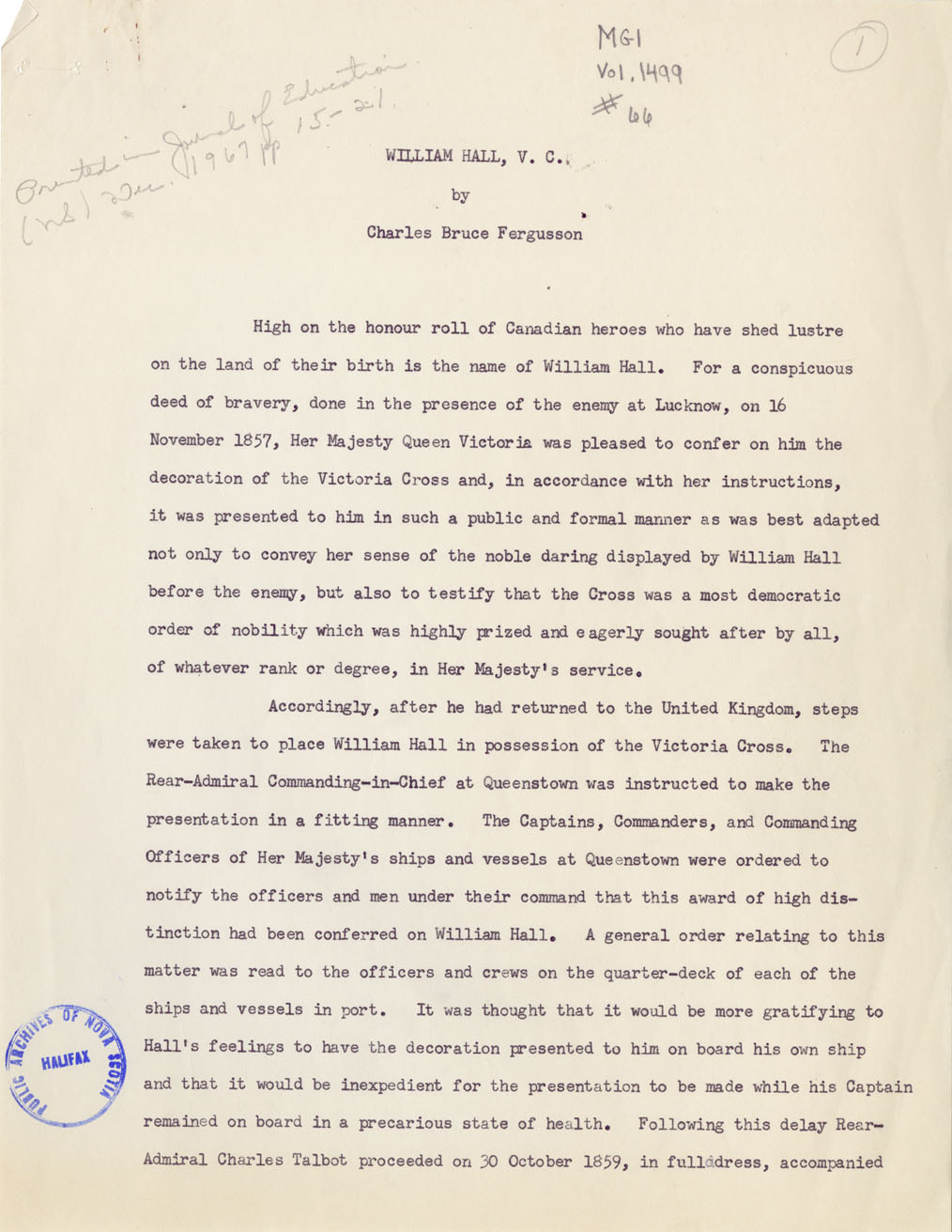 Reference William Hall, VC Nova Scotia Archives MG 1 volume 1499 number 66