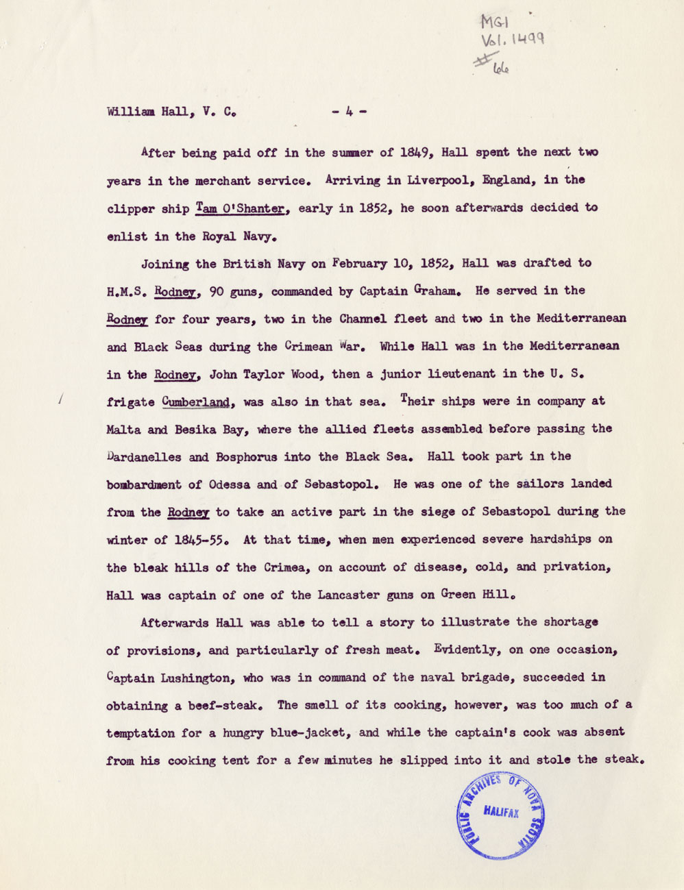 Reference William Hall, VC Nova Scotia Archives MG 1 volume 1499 number 66