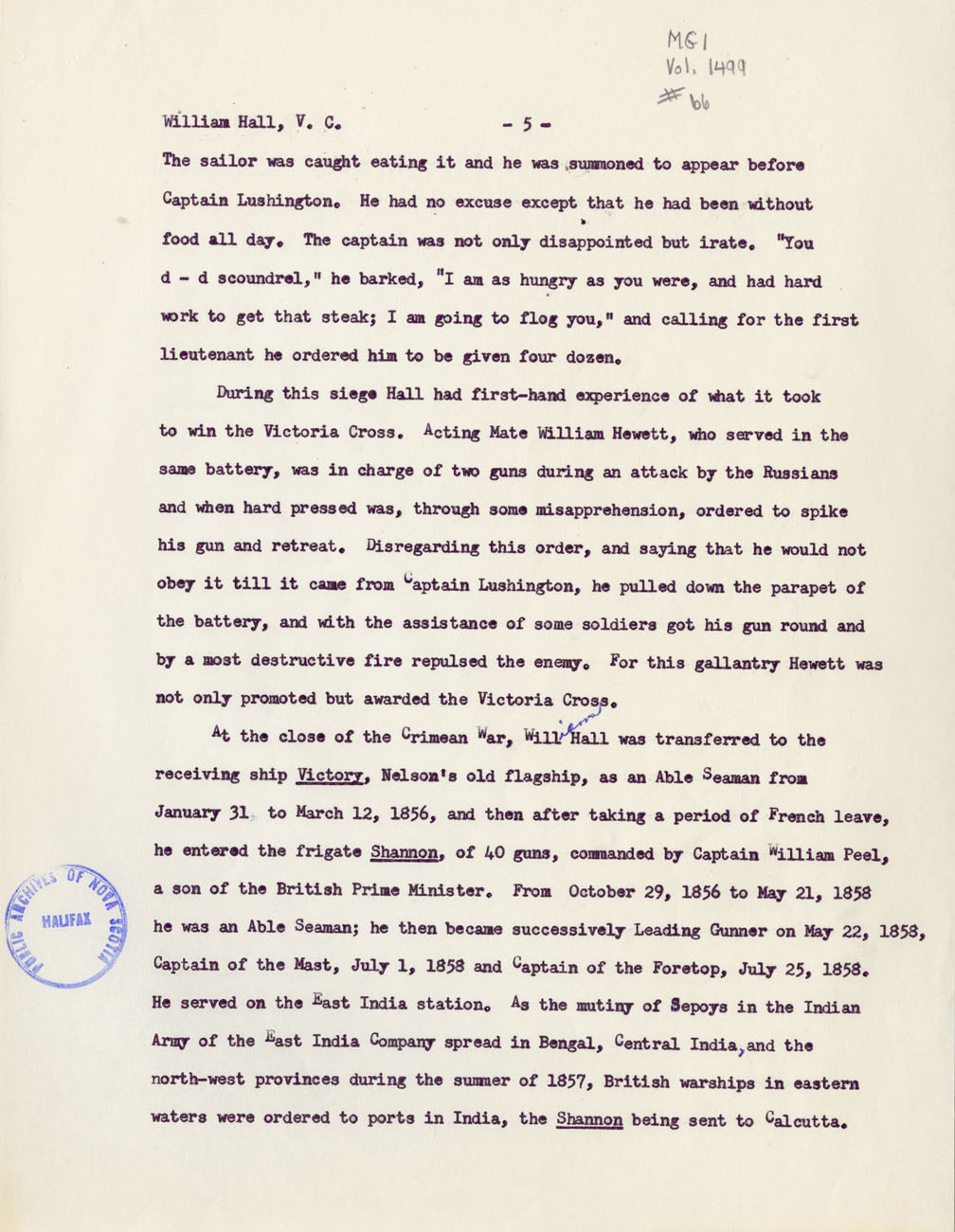 Reference William Hall, VC Nova Scotia Archives MG 1 volume 1499 number 66