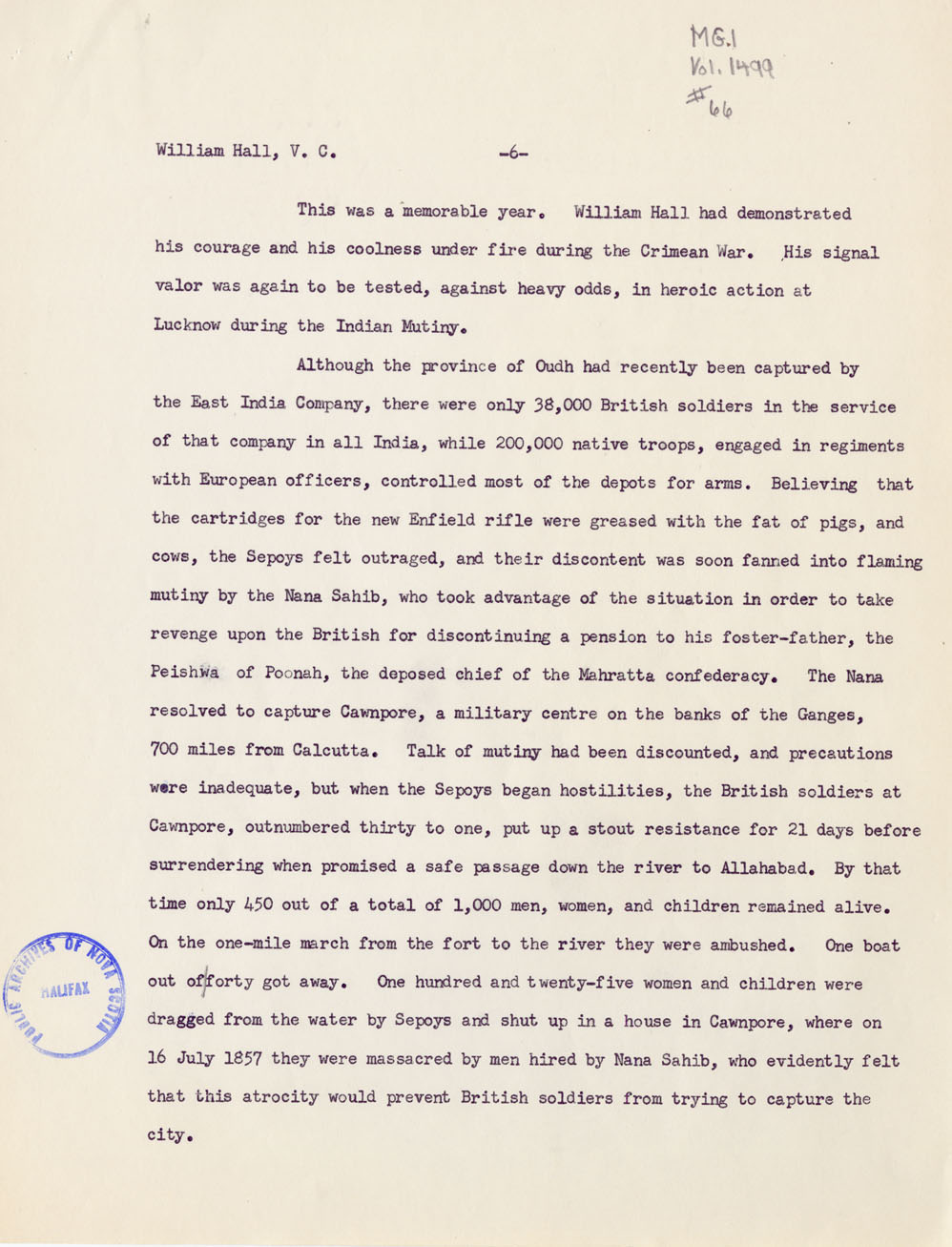 Reference William Hall, VC Nova Scotia Archives MG 1 volume 1499 number 66