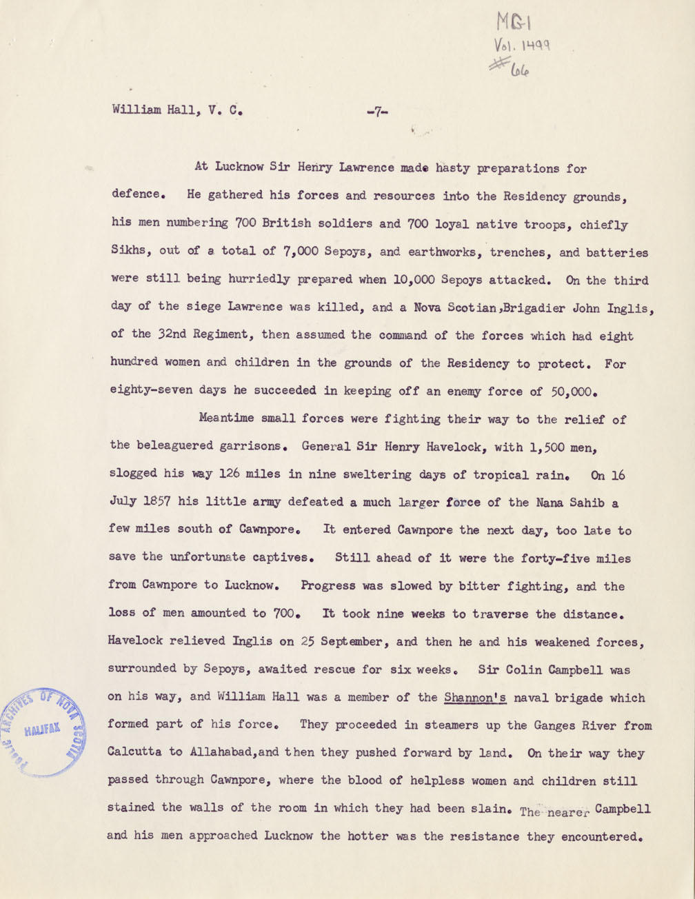 Reference William Hall, VC Nova Scotia Archives MG 1 volume 1499 number 66