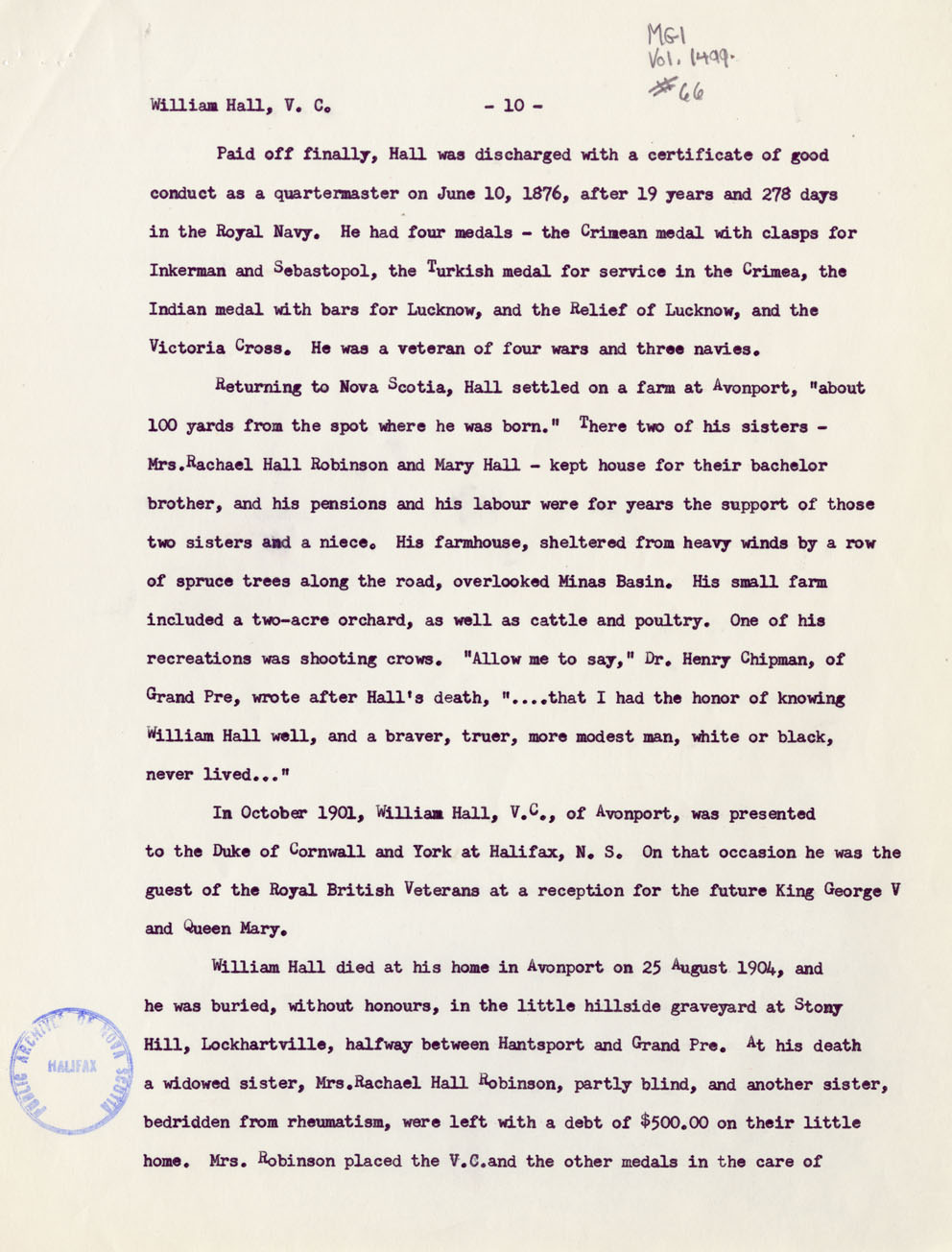 Reference William Hall, VC Nova Scotia Archives MG 1 volume 1499 number 66
