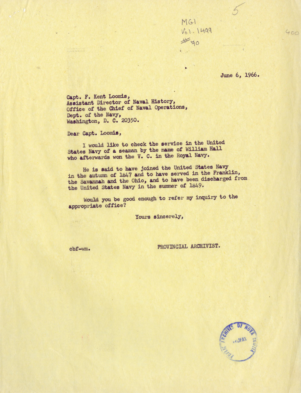Reference William Hall, VC Nova Scotia Archives MG 1 volume 1499 number 70